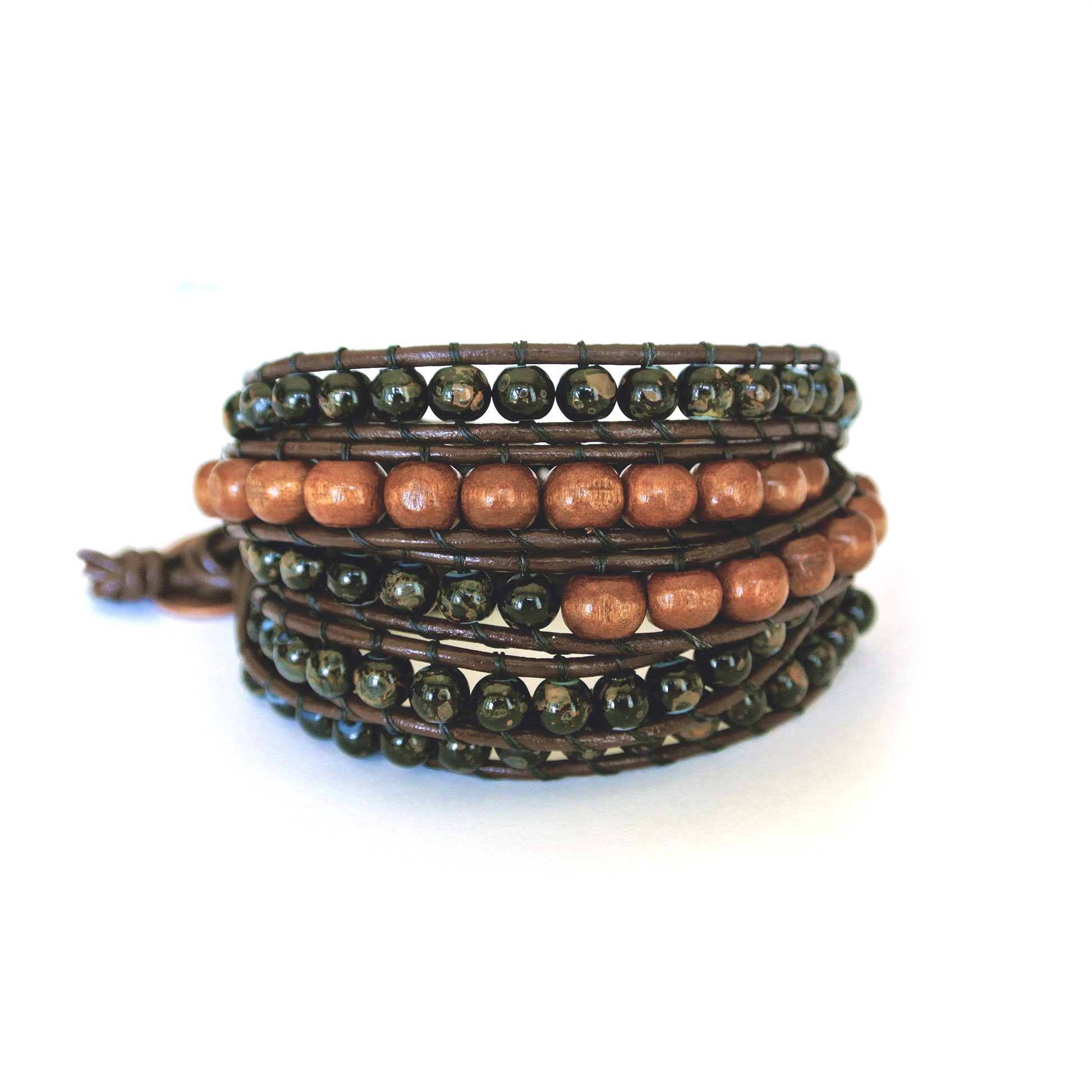 Men's 5x wrap bracelet featuring 6-8mm wood & glass beads on black leather. Fastens with an engraved Willamy metal button.