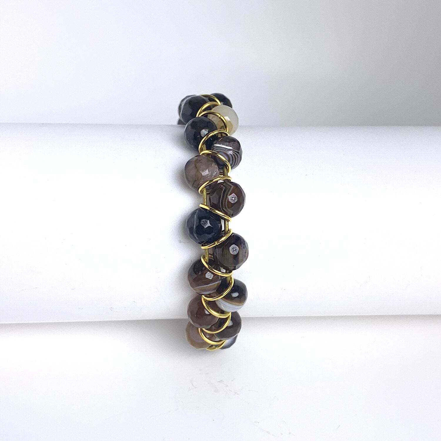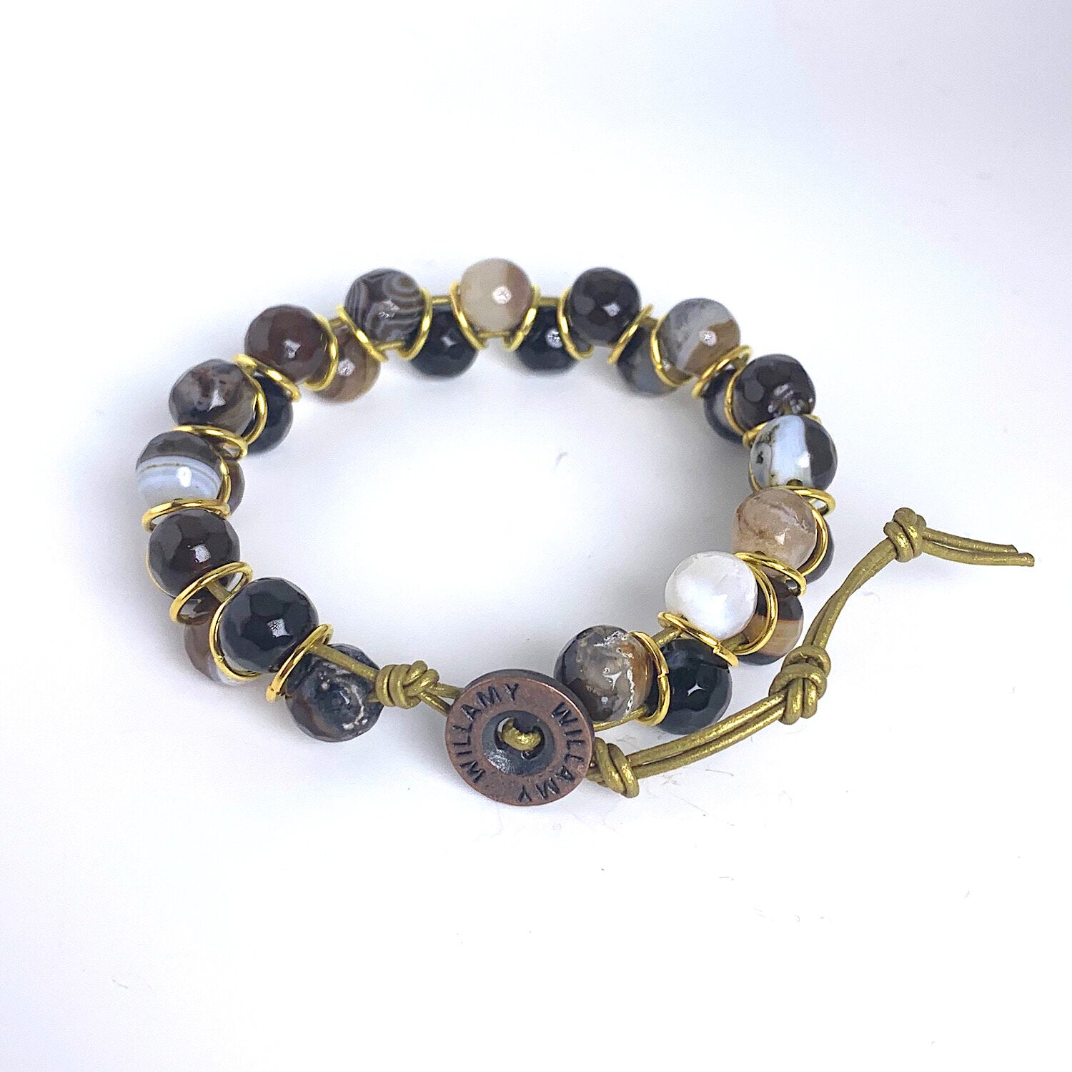 Our Cappucino Windsor single wrap bracelet features 10MM Faceted Agate Stones on natural leather. Fastens with an engraved Willamy metal button. =