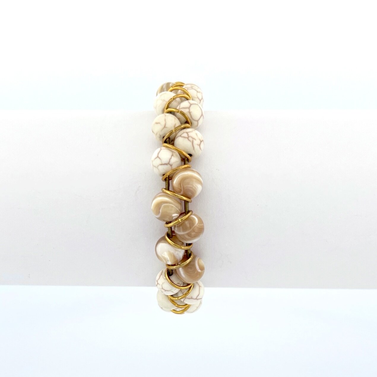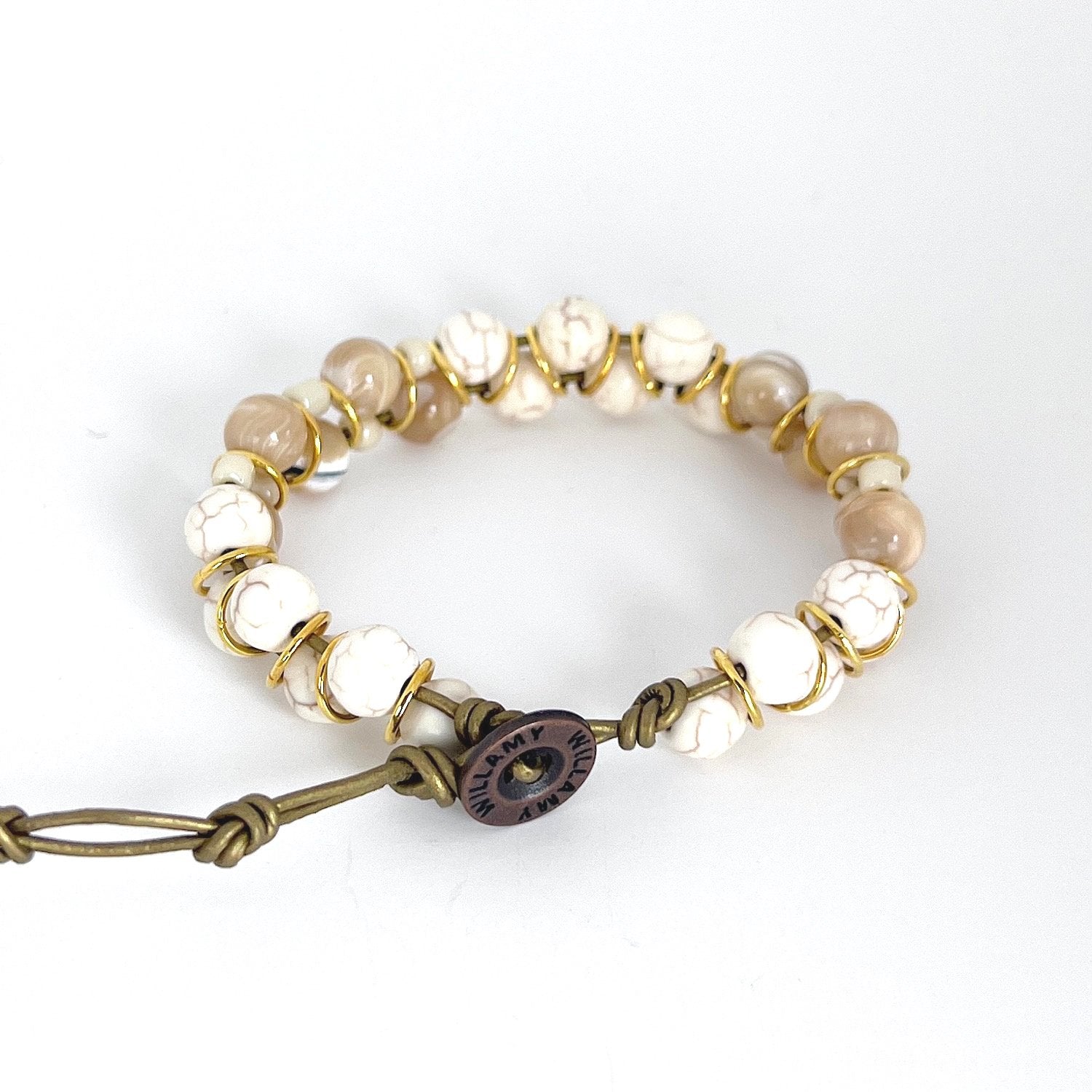 Handcrafted with eye-catching Trochus Shell stones alongside cream Howlite stones on genuine leather with cream glass seed beads. Fastens with an engraved Willamy metal button.