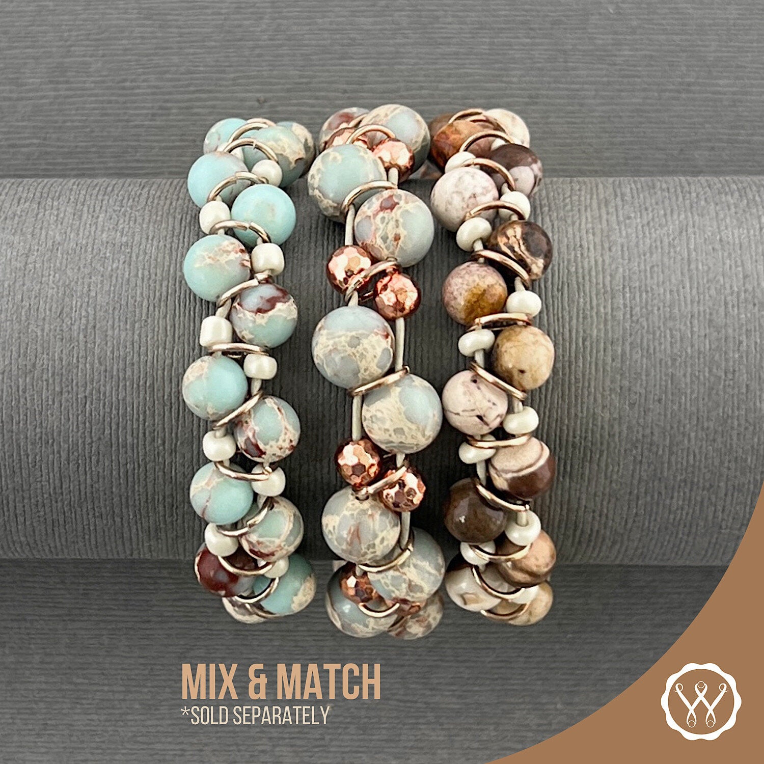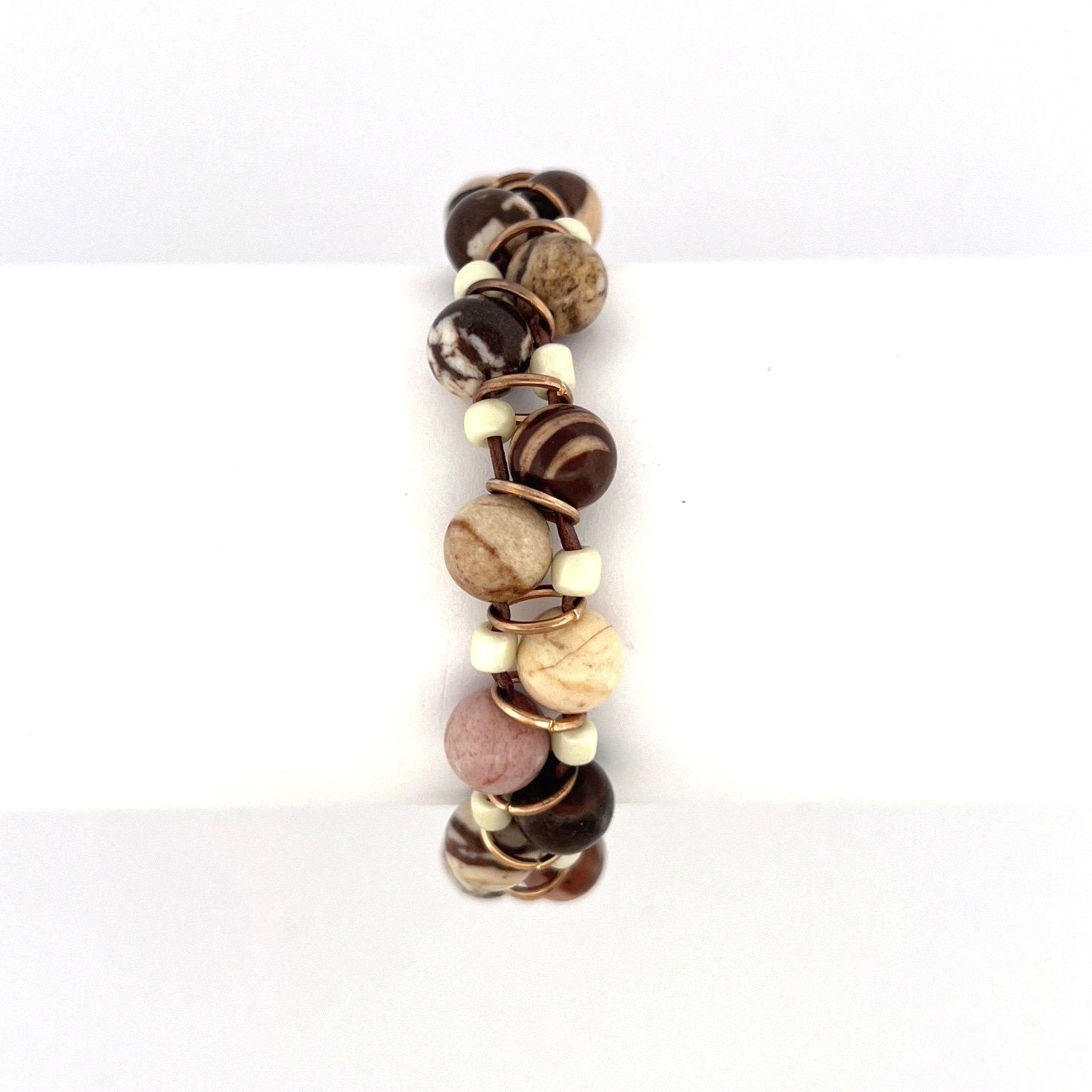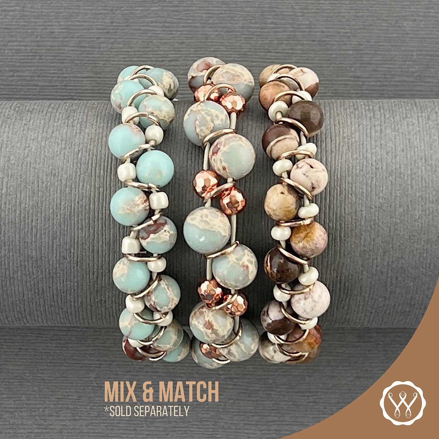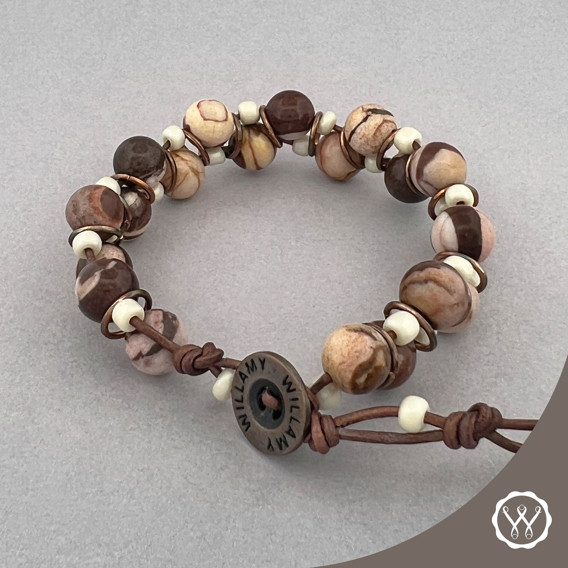 Distinguishable and contemporary, our Australian Agate bracelet is made with multi-brown agate stones, glass accent beads and rose-gold tone jump rings on off-white leather. Includes XS-S-M-L Sizing Options And button closure.