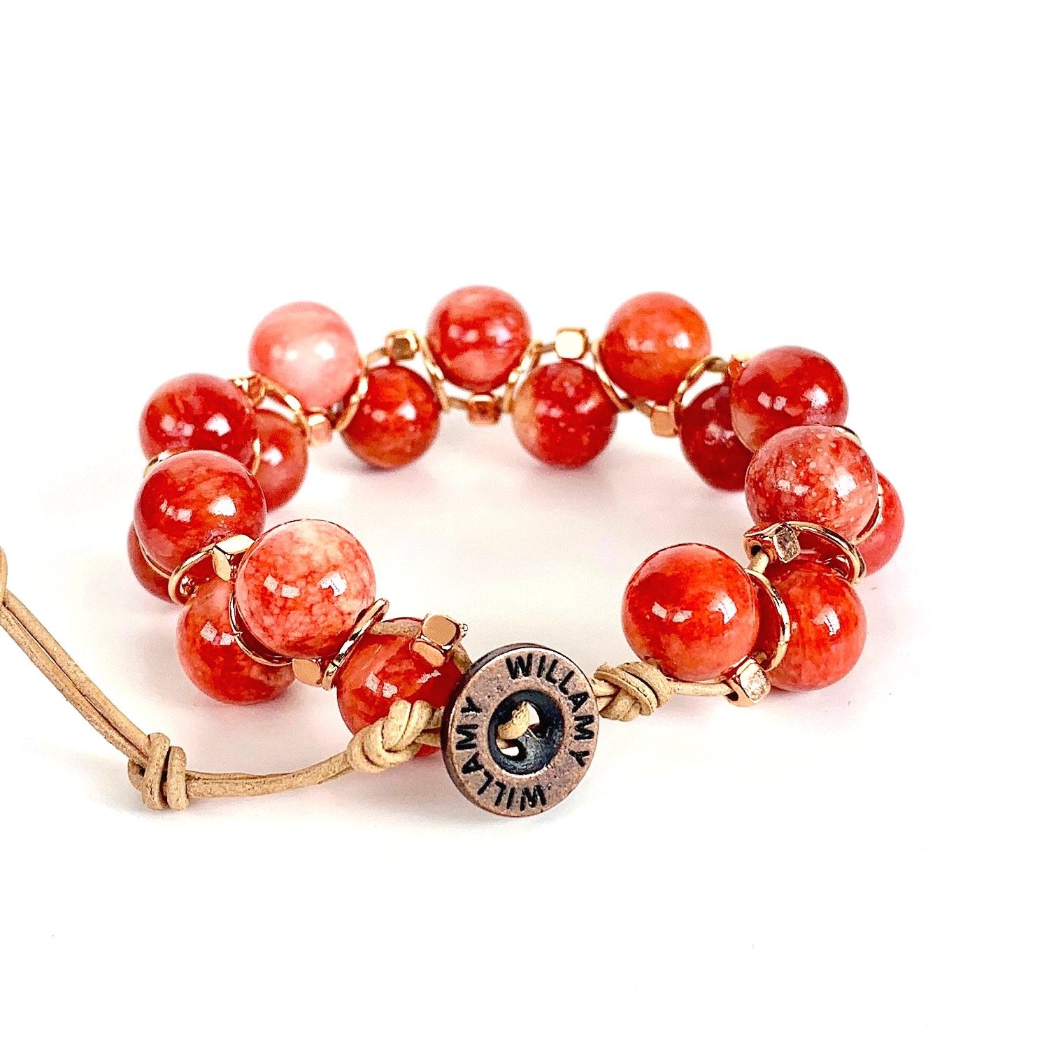 Our Limited Edition Cherry Blossom single wrap bracelet features stunning 10mm genuine Quartzite stones and rose-gold plated accent beads on natural leather. Fastens with an engraved Willamy metal button.
