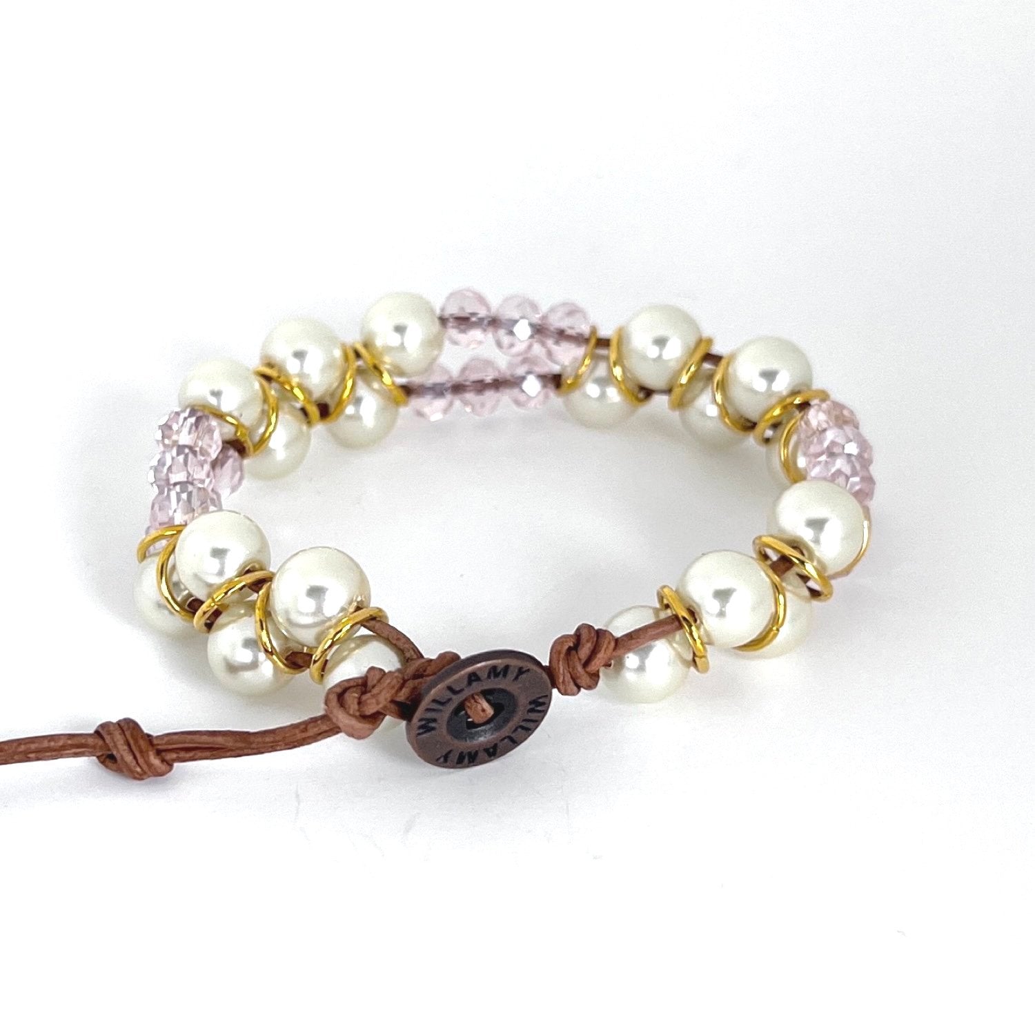 Opulent and timeless, our cream Czech glass pearls are composed in an asymmetrical fashion with pink shimmering crystals and gold tone jump rings to add a layer of glowing warmth. Handcrafted on natural, genuine leather and fastens with an engraved Willamy metal button.