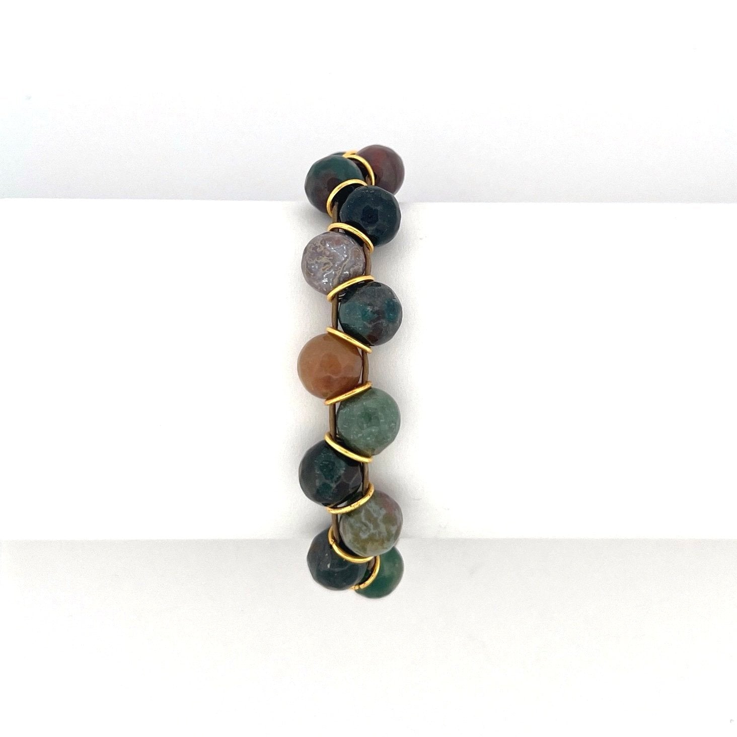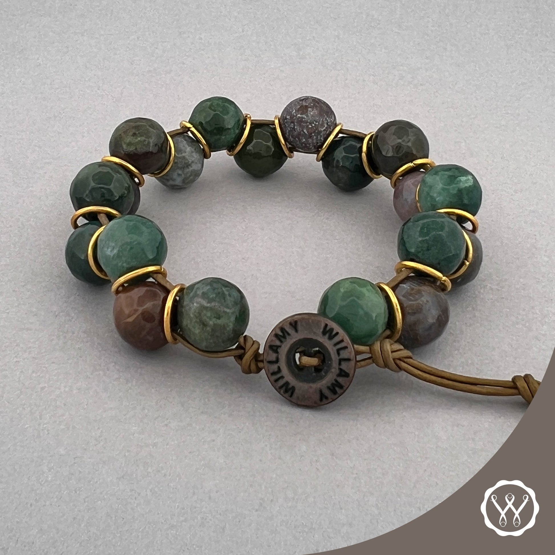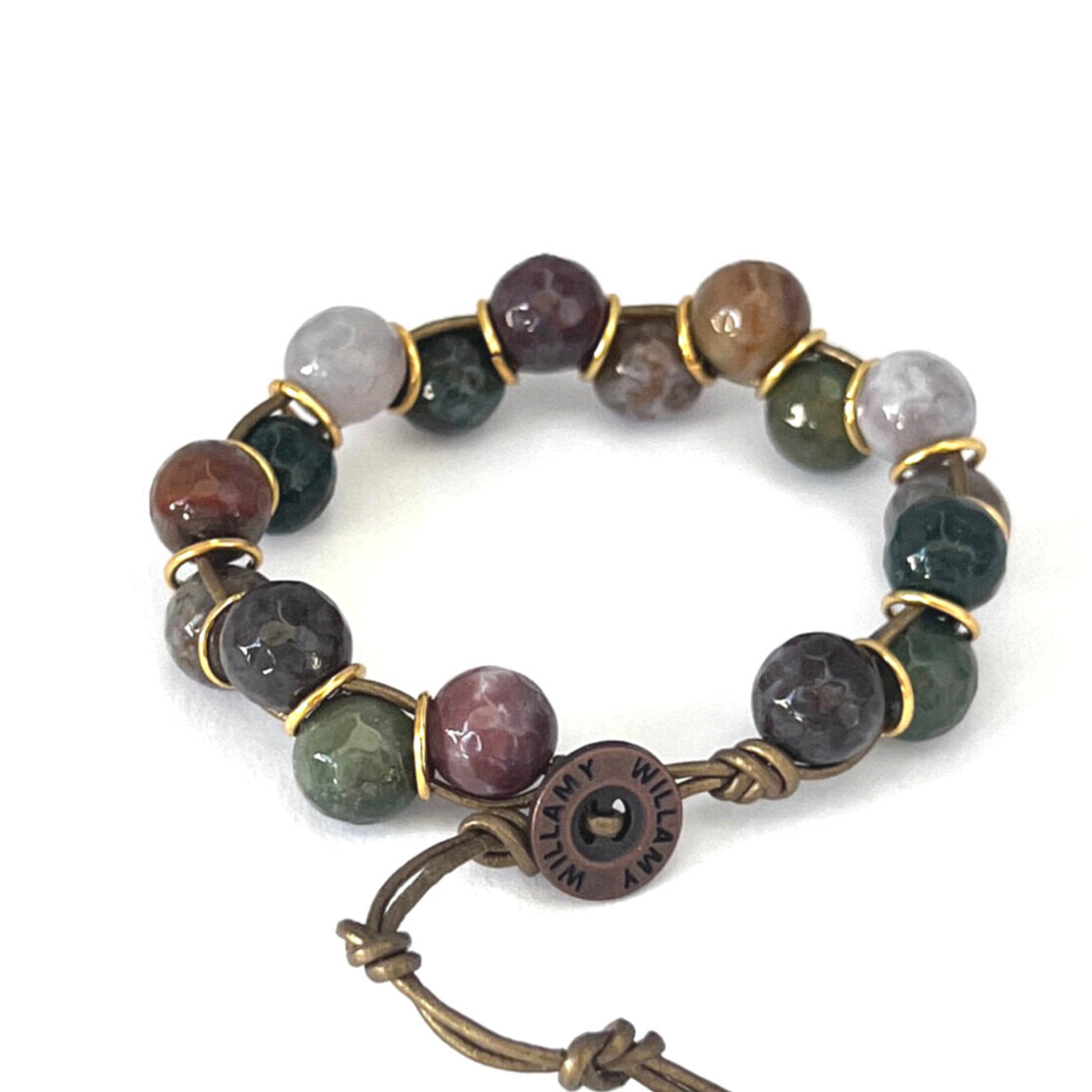 Our Riverbend stackable bracelet features stunning & colorful 10mm India Agate stones accented with gold tone seed beads on metallic leather. Fastens with an engraved Willamy metal button.