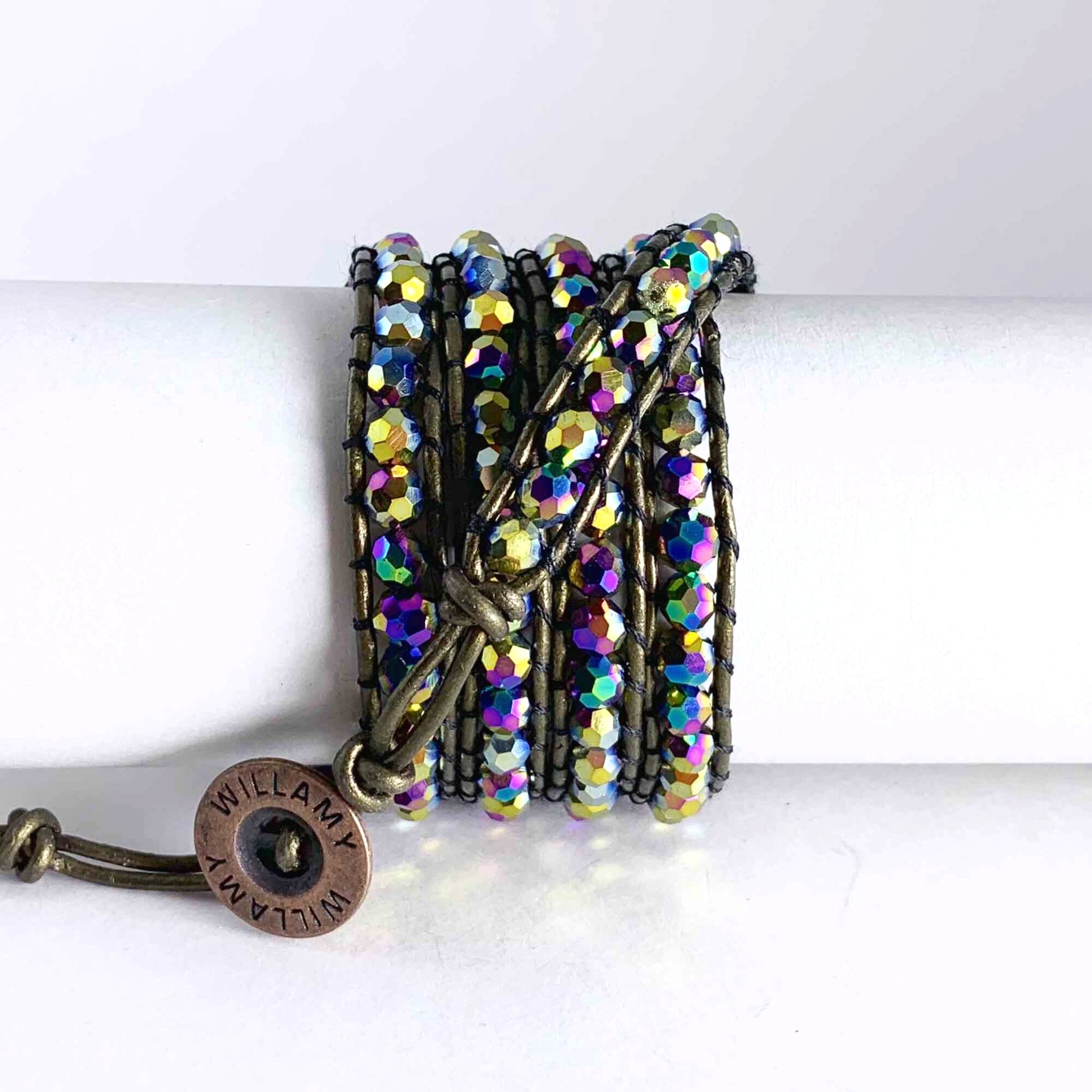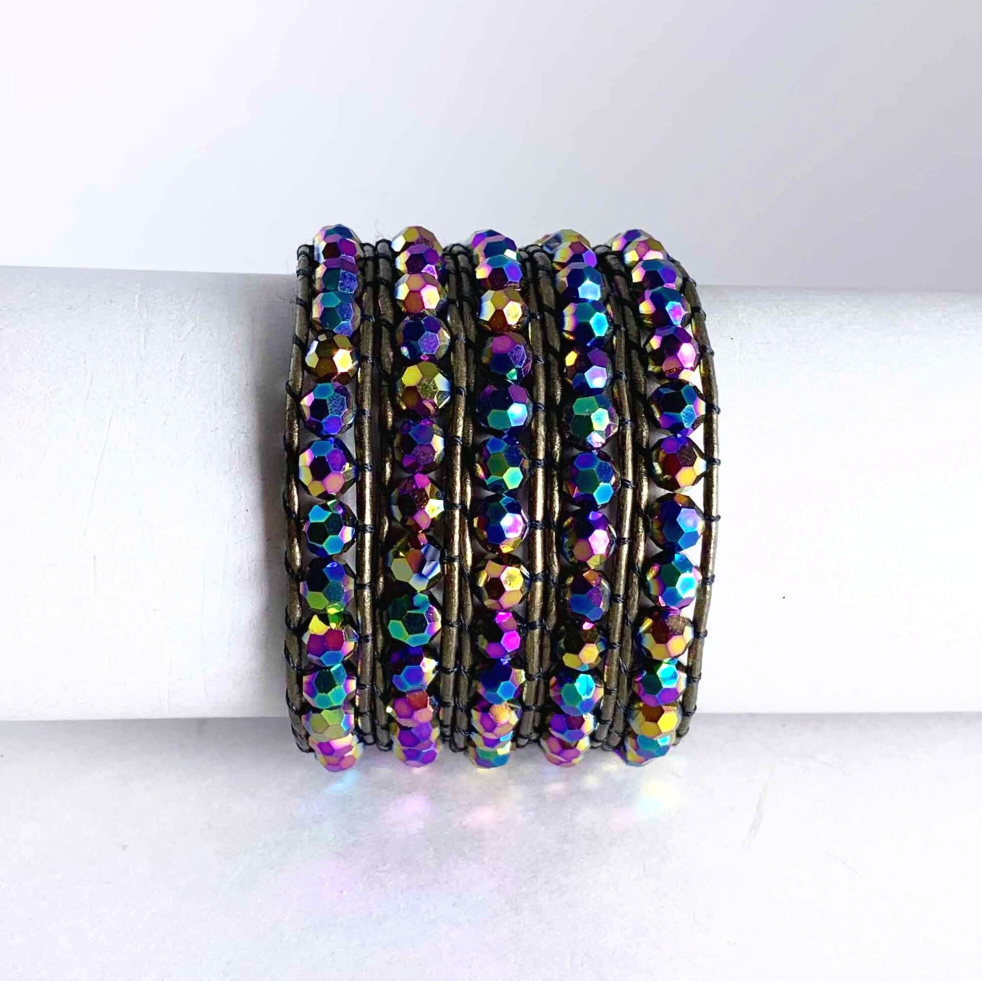 Flirty and fun, our Confetti wrap is versatile and eye-catching. handcrafted with multi-colored metallic beads on black leather, it’s a must-have day or night accessory!