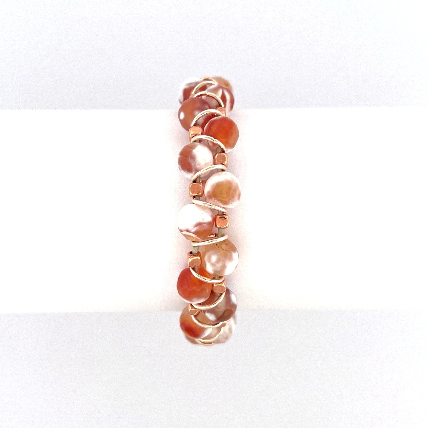 This multi-faceted frosted agate bracelet is a must-have, offering a soft and natural look. Handcrafted with faceted Agate stones, rose-gold tone jump rings and ivory leather. Fastens with an engraved Willamy button.