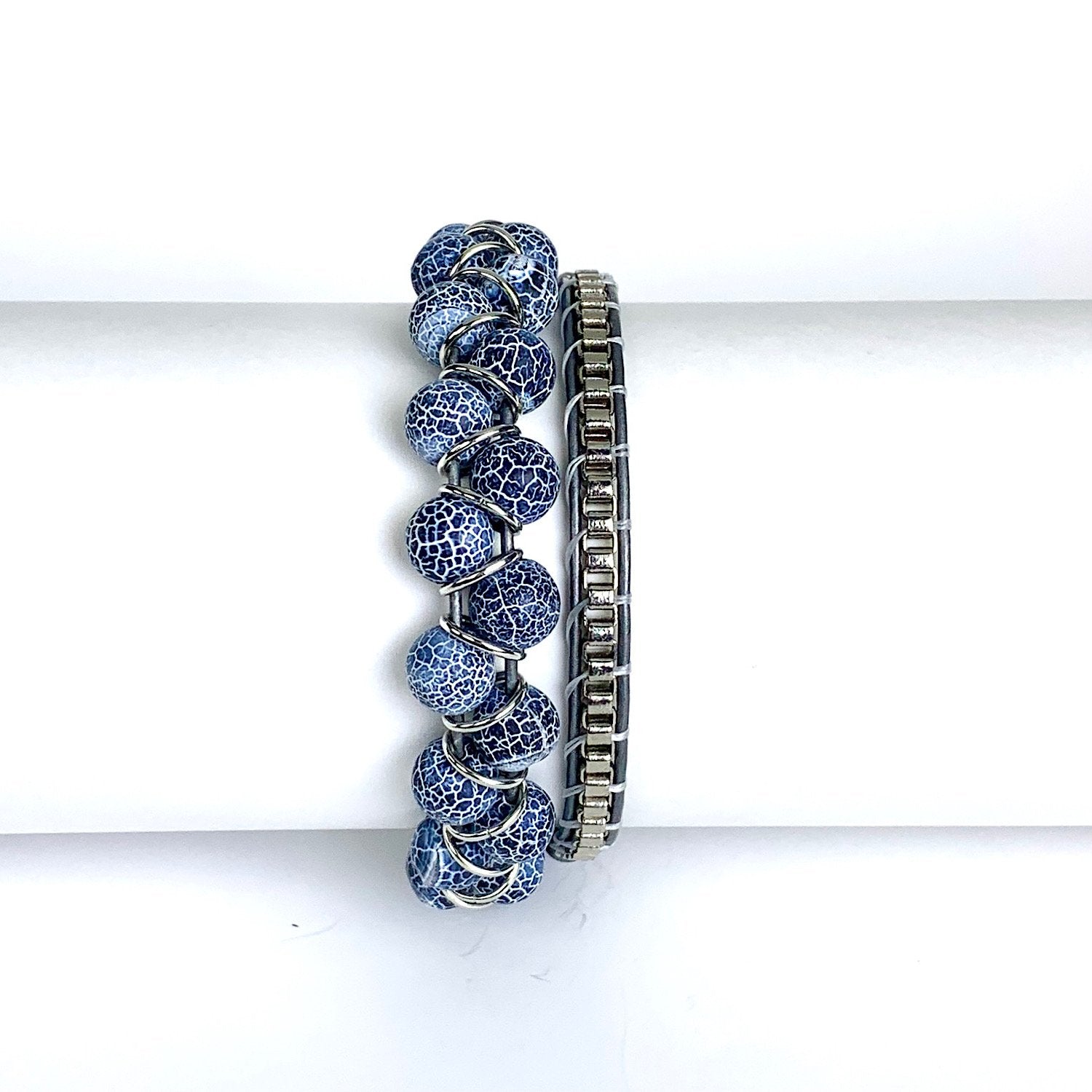 Our Denim Box Chain double wrap is a new take on our classic look, featuring 8mm Blue Crackled Agate and silver-plated box chain on silver leather, its a top seller for a reason! Fastens with an engraved Willamy metal button.