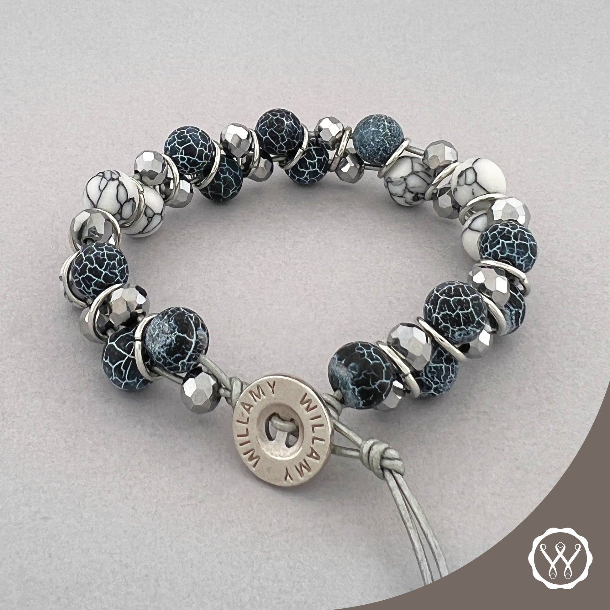 (1) 8mm Crackled Blue Agate & Howlite Leather Bracelet with Silver-tone Crystals & Metal Jump Rings