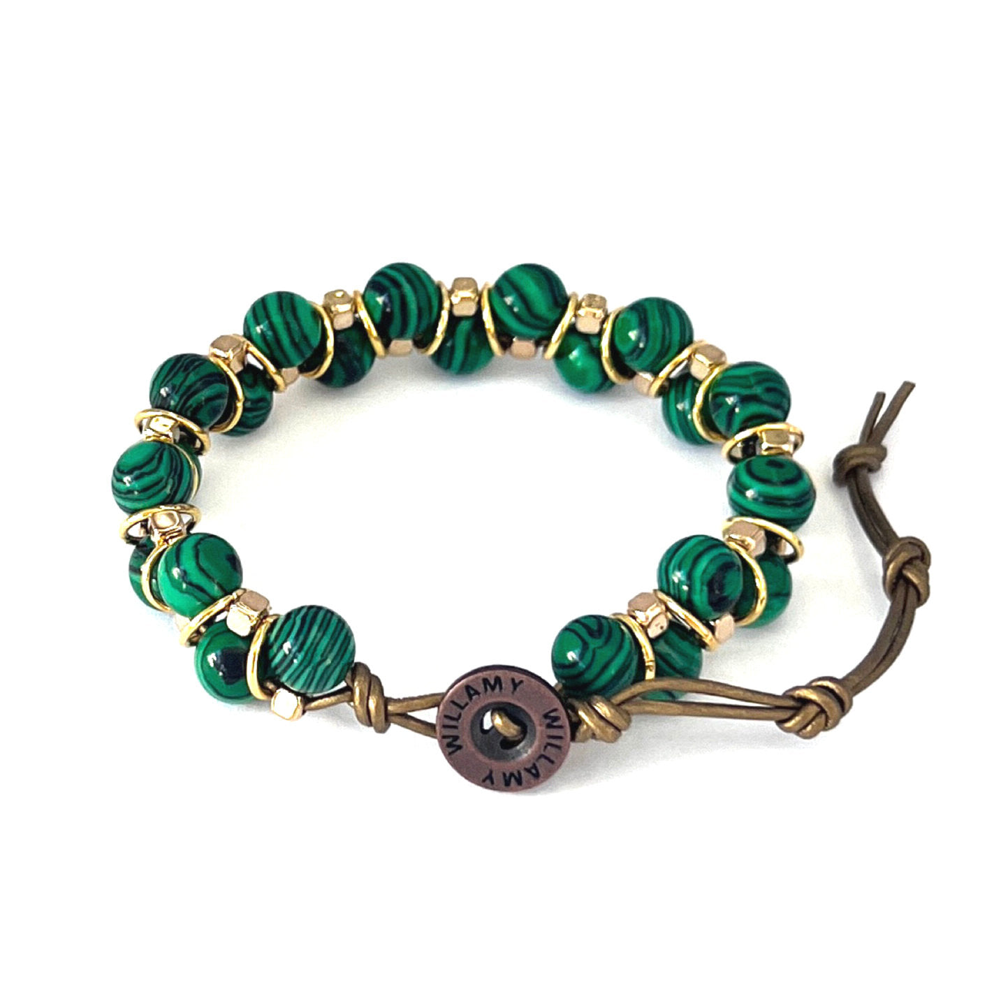 Tis the season for our popular Malachite stone Emerald Sea bracelet featuring genuine stones and gold-tone accent beads on natural leather. Fastens with an engraved Willamy metal button. Includes XS-S-M-L Sizing Options