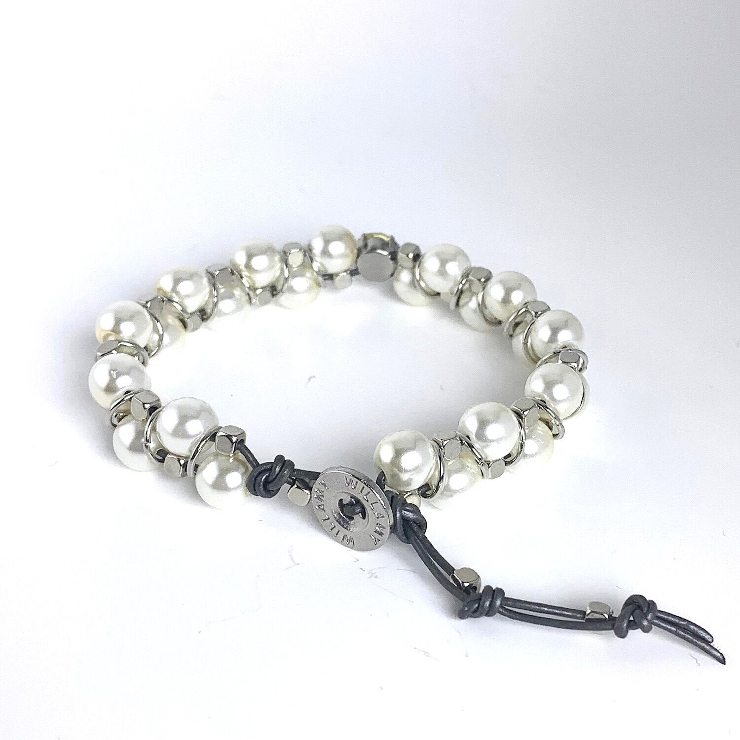 Our Fancy White Pearl Windsor single wrap bracelet features stunning 8mm glass pearls accented with a rhinestone and metal jump rings on gray leather. Fastens with an engraved Willamy metal button.
