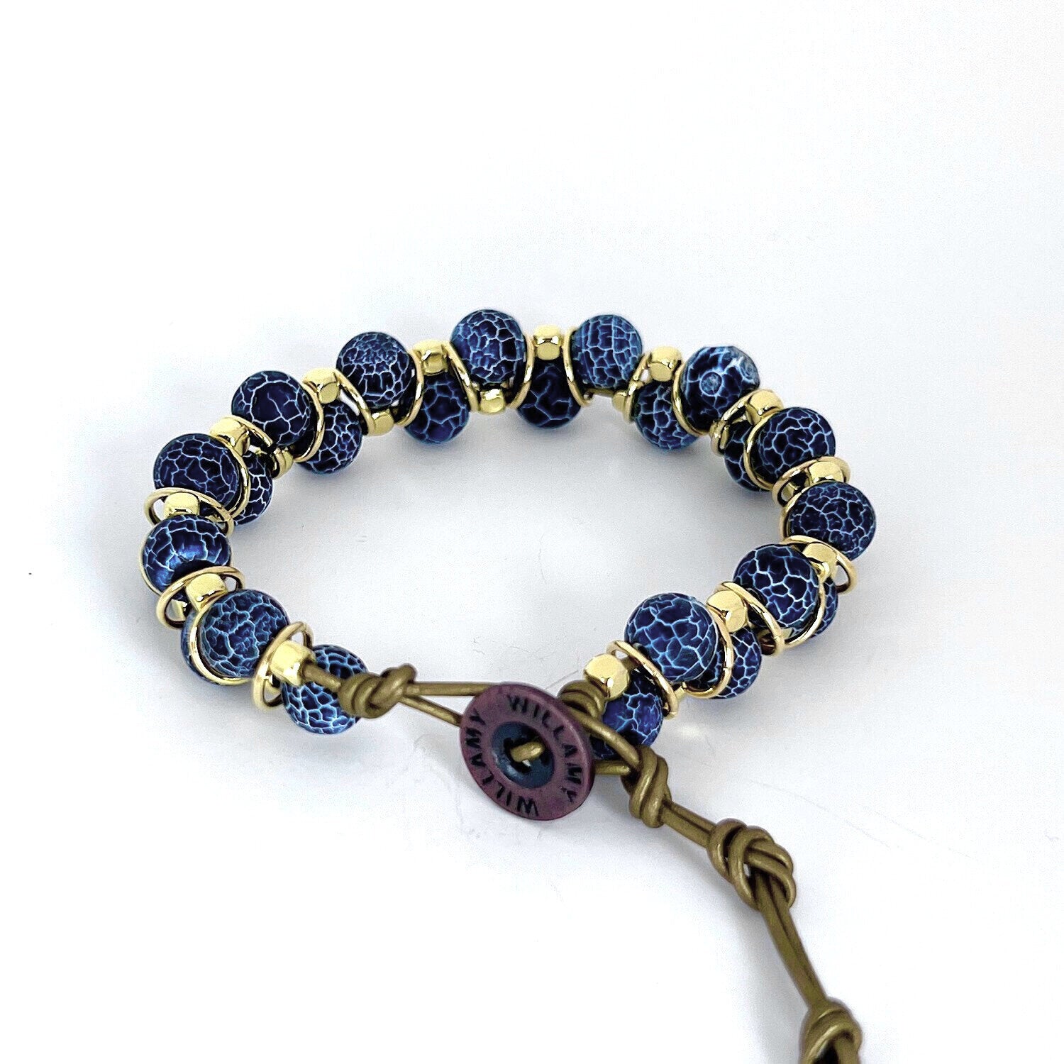 Gold Denim: 8mm blue crackled agate with gold-tone side beads. An adjustable closure accommodates wrists 6.5" to 8.5". Handmade in the USA.