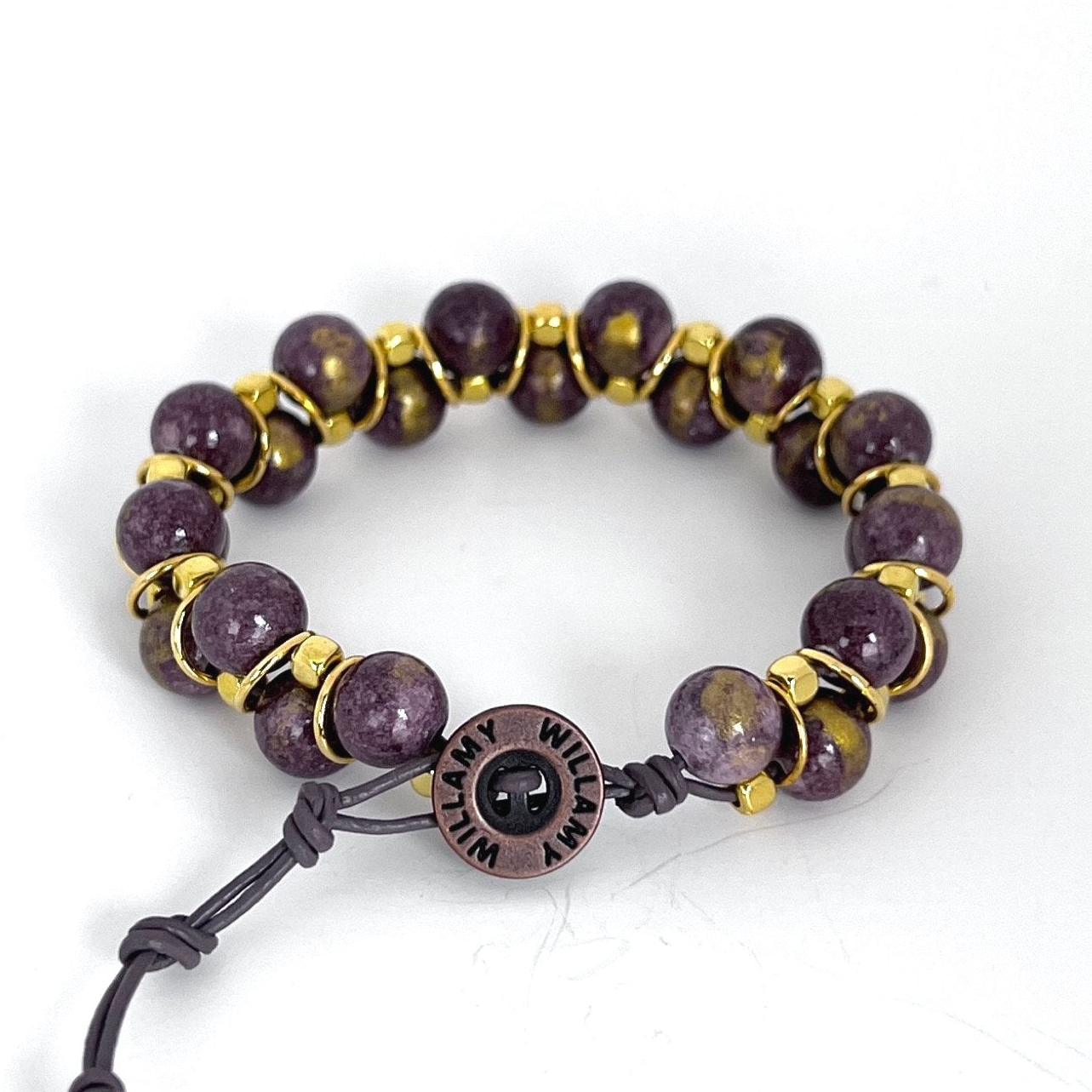 Royal Shimmer Jade: 8mm jade stones with gold metal accents and jump rings. An adjustable alloy button closure fits wrists 6.5" to 8.5". Handmade in the USA.