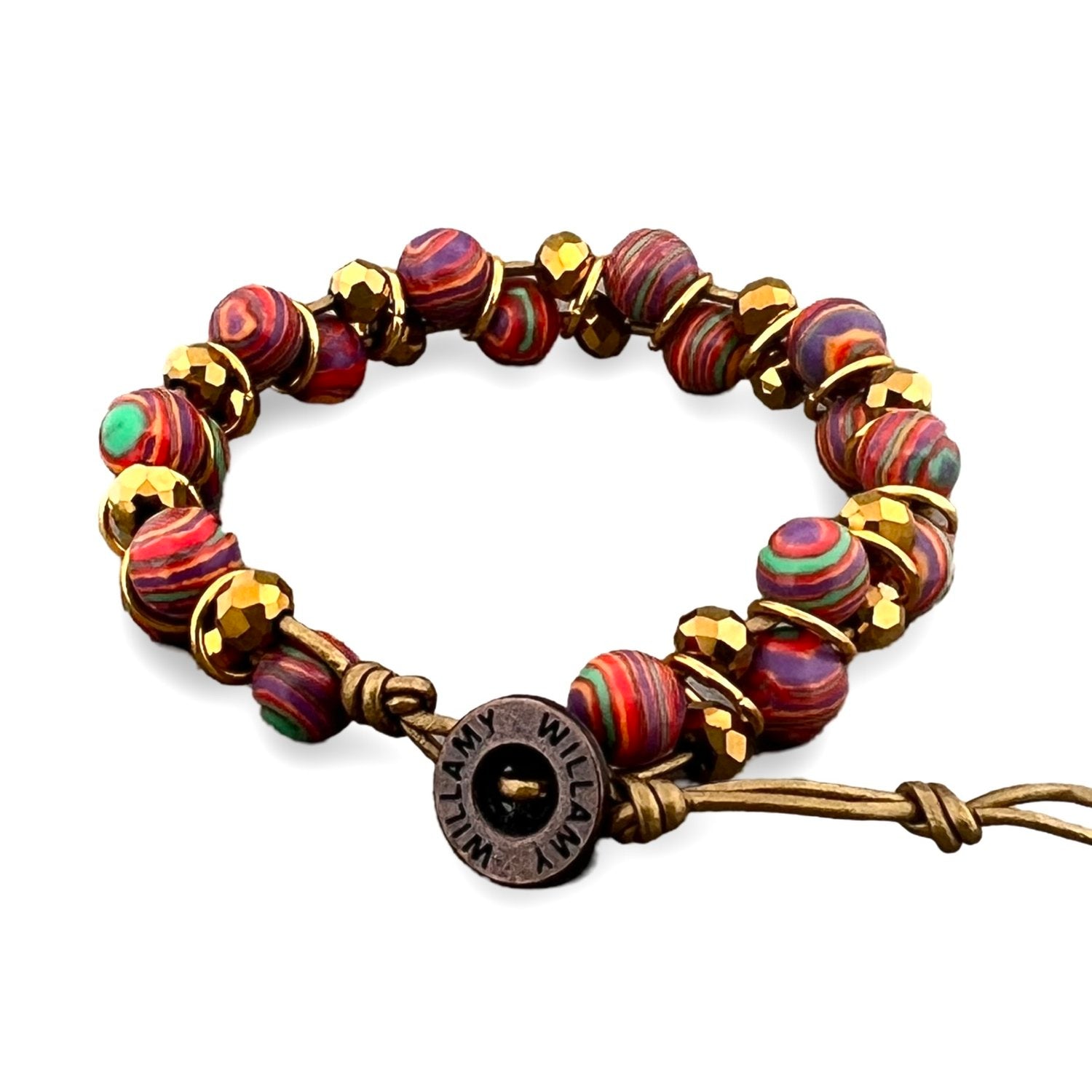 Sedona: 8mm rainbow stones and 6mm gold crystals on natural leather with metal accents. Adjustable button closure fits wrists 6.5" to 8".