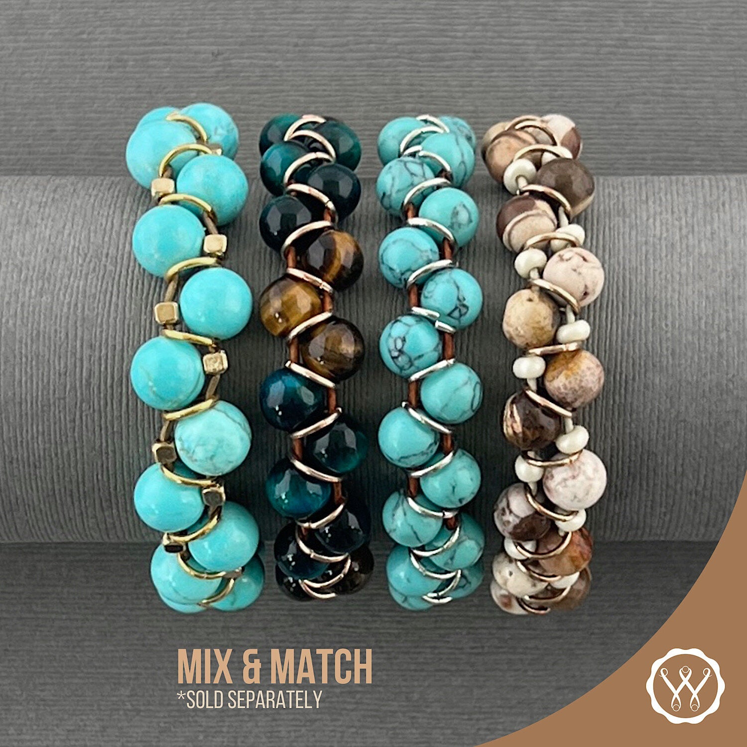 Our classic Turquoise stone has a new look with gold accent beads and jump rings on dark brown leather. A perfect combination of color and class. Fastens with an engraved Willamy metal button.