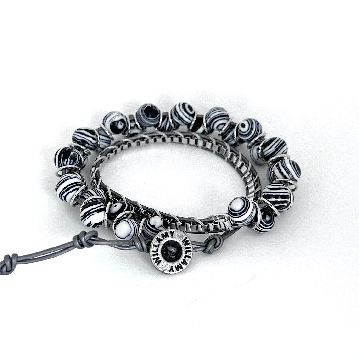 A classic take on our popular Pink Zebra Jasper stone, this Black & White version is a must-have and a perfect match to any outfit. Handcrafted on genuine leather and stainless steel chain. Fastens with an engraved Willamy metal button.