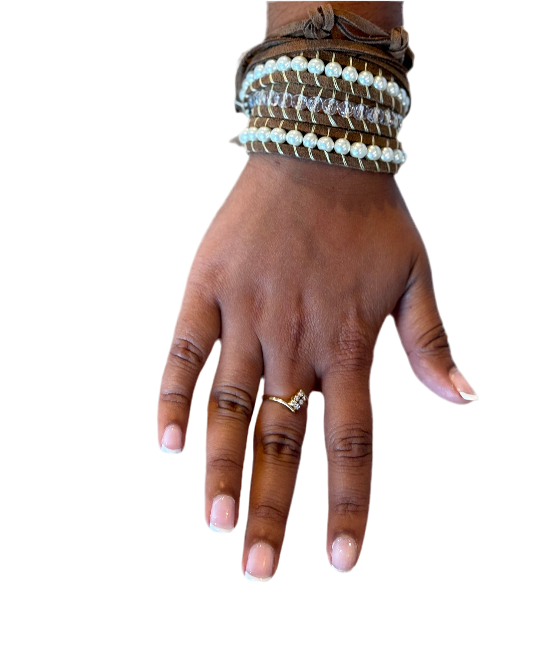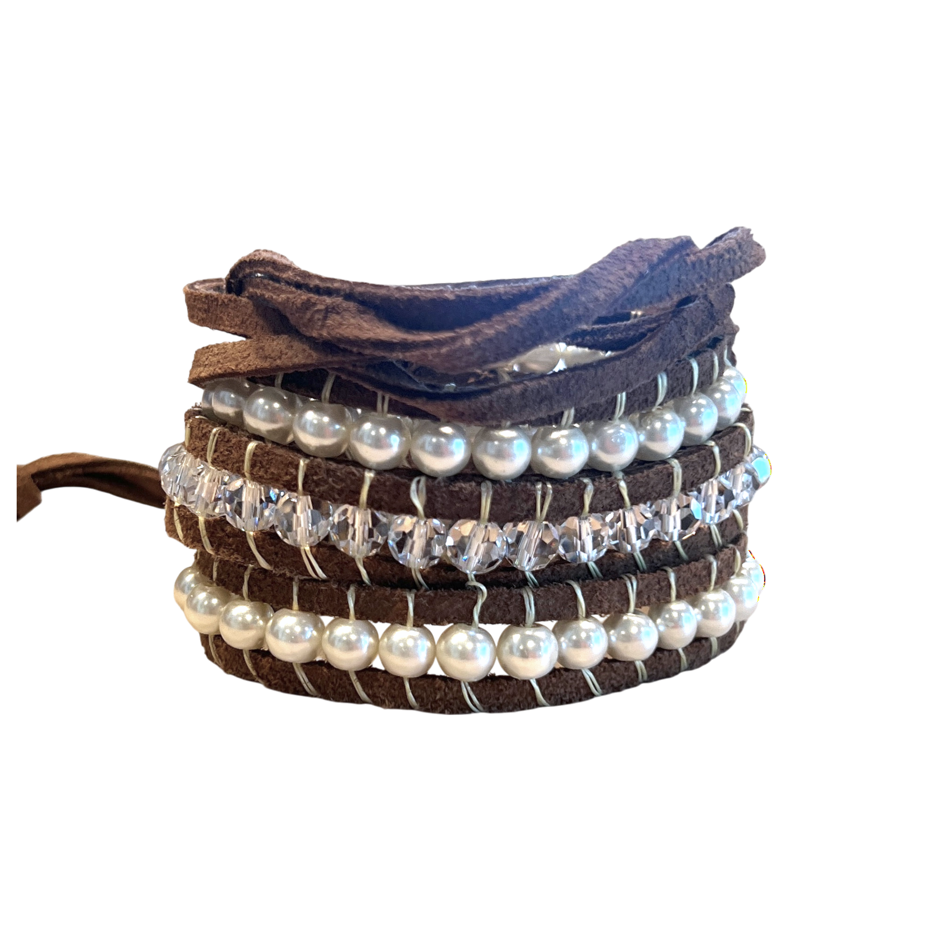Our top selling Suede Wraps are the perfect combination of charm and rustic beauty. Handcrafted with genuine crystals and glass pearls on brown suede, it’s a sleek & timeless piece for any occasion!