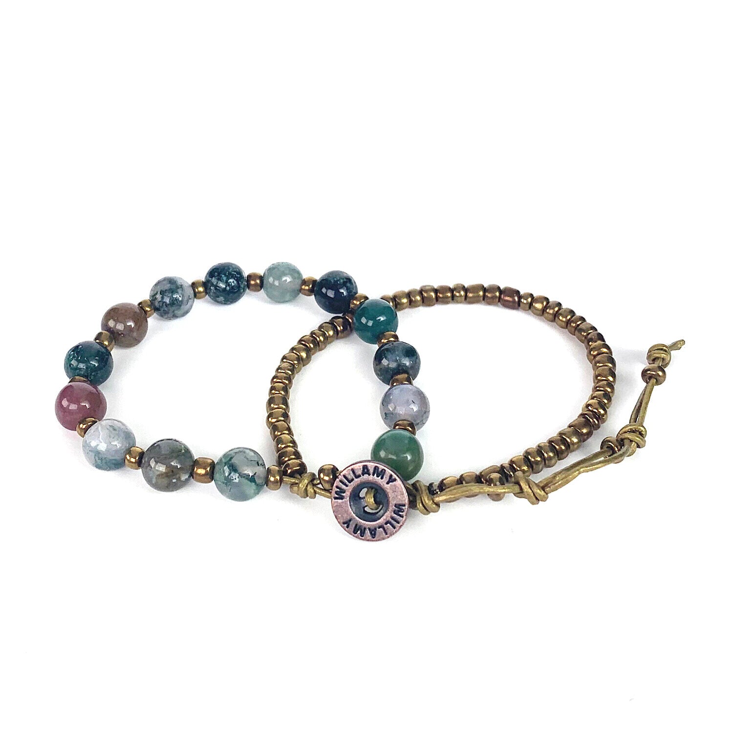 Set of of leather bracelets handcrafted with India Agate & Miyuki glass beads on genuine leather. Fastens with an engraved Willamy metal button.