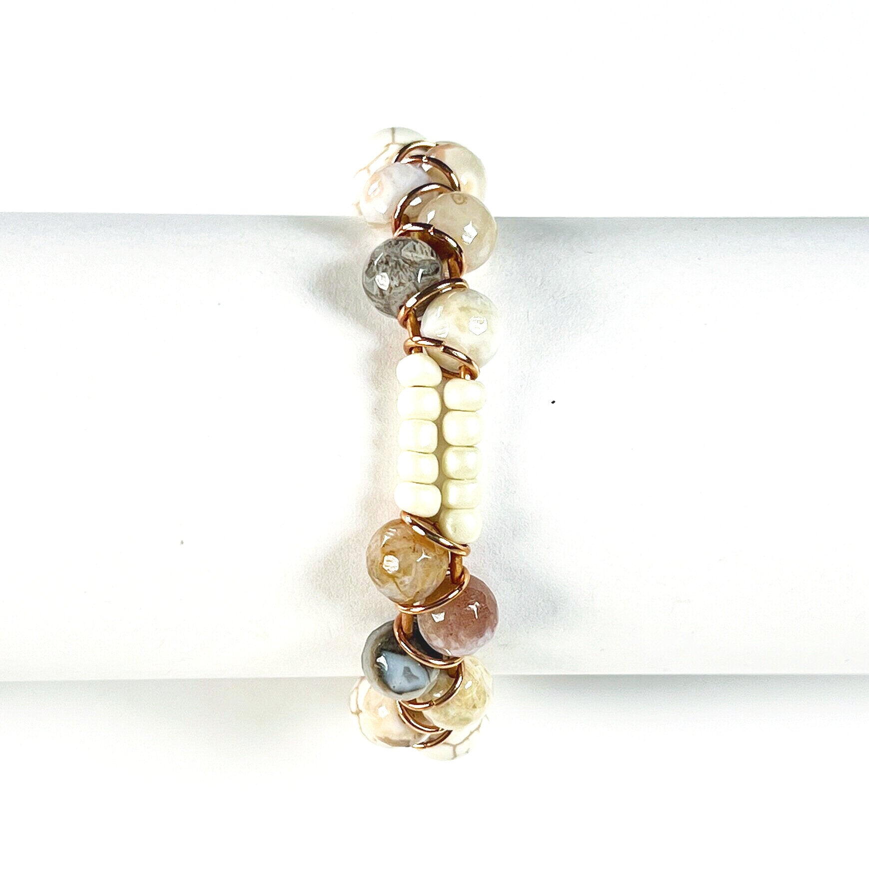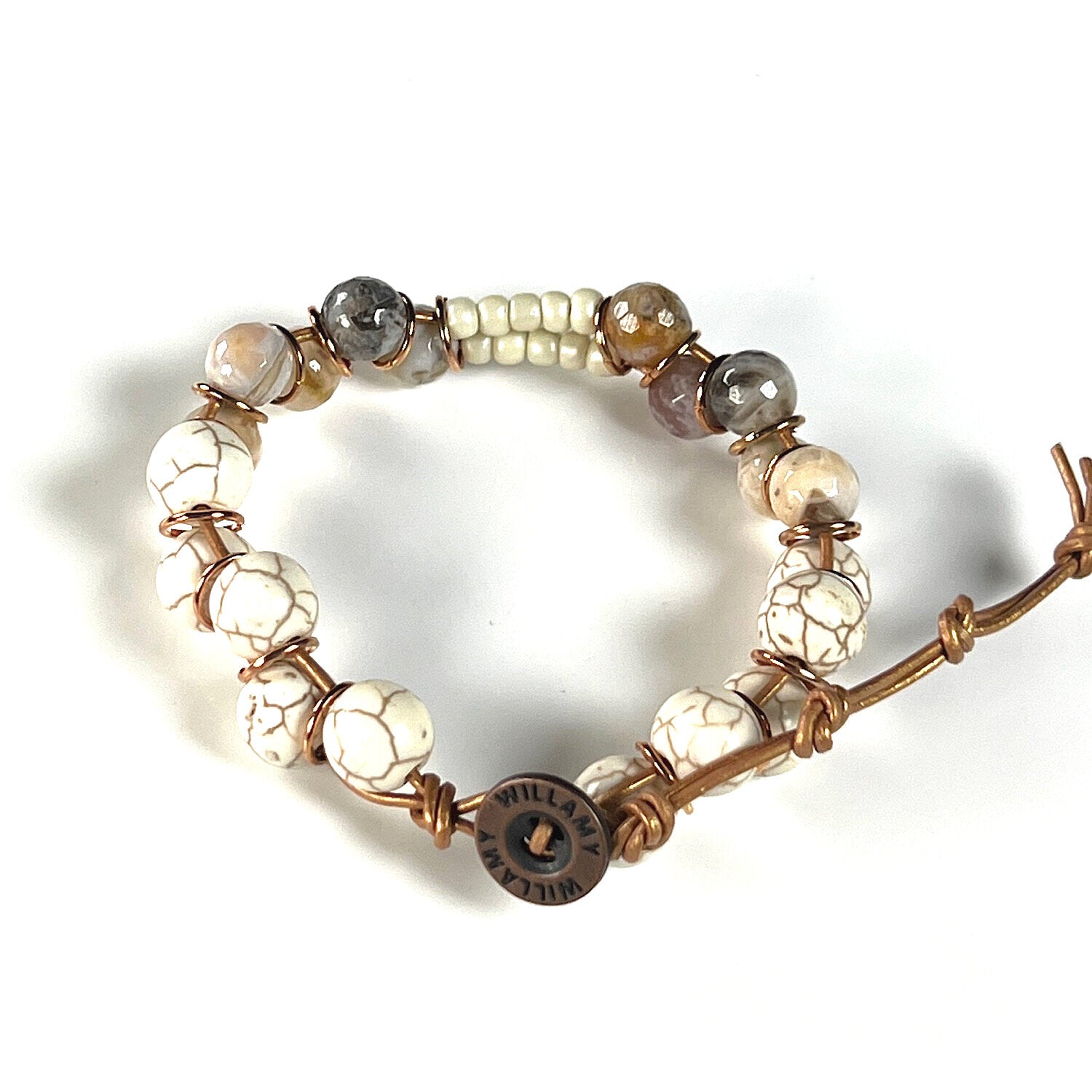 Our Ivory Coast Couture features graduated stones starting with 10mm Howlite, 8mm Marble Agate, glass seed beads on natural tan leather for an eye-catching look. Fastens with an engraved Willamy metal button.