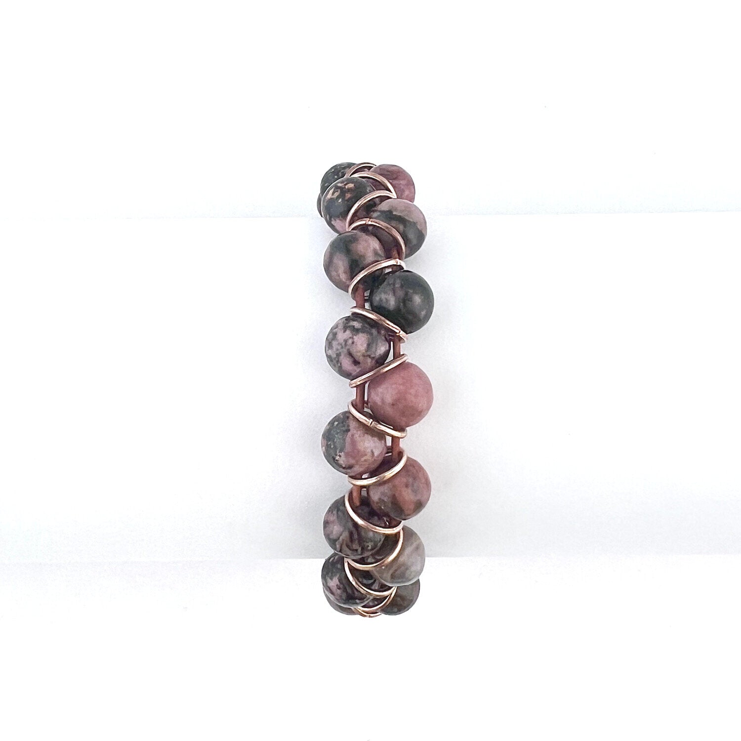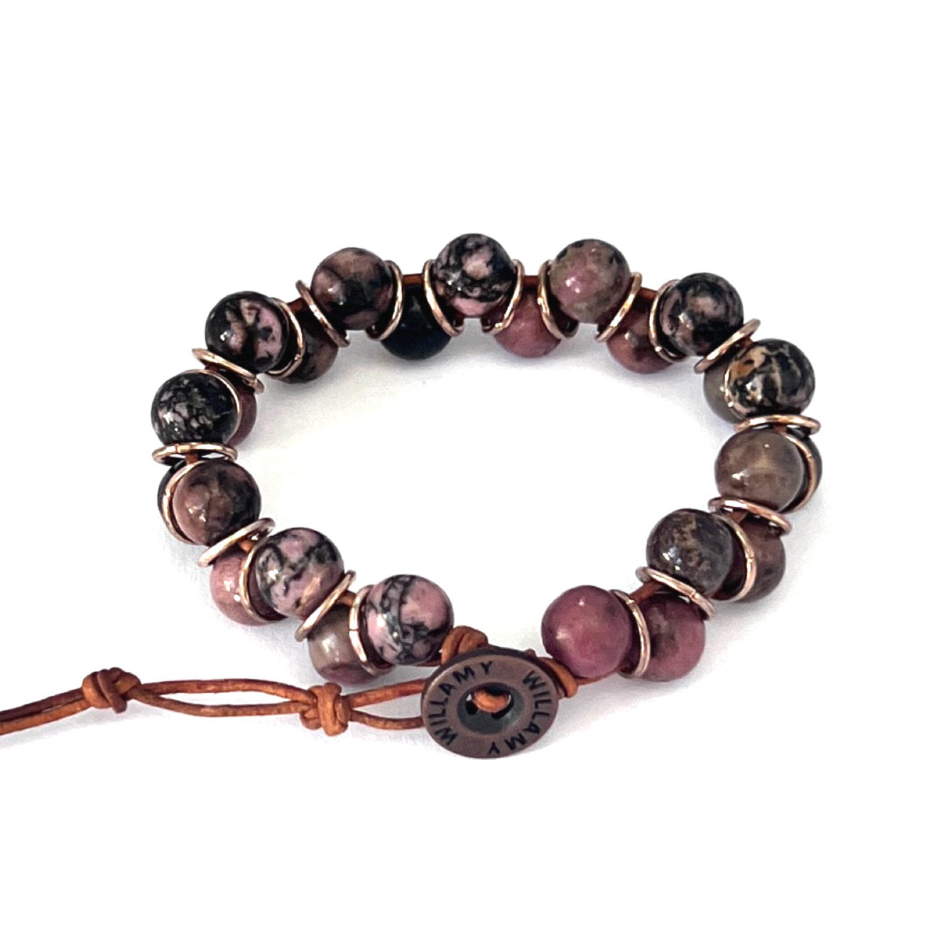An earthy and natural look, our Khaki Rose bracelet features black line pink Agate with rose-gold tone jump rings on natural leather. Fastens with an engraved Willamy metal button. Includes XS-S-M-L Sizing Options & Button Clasp