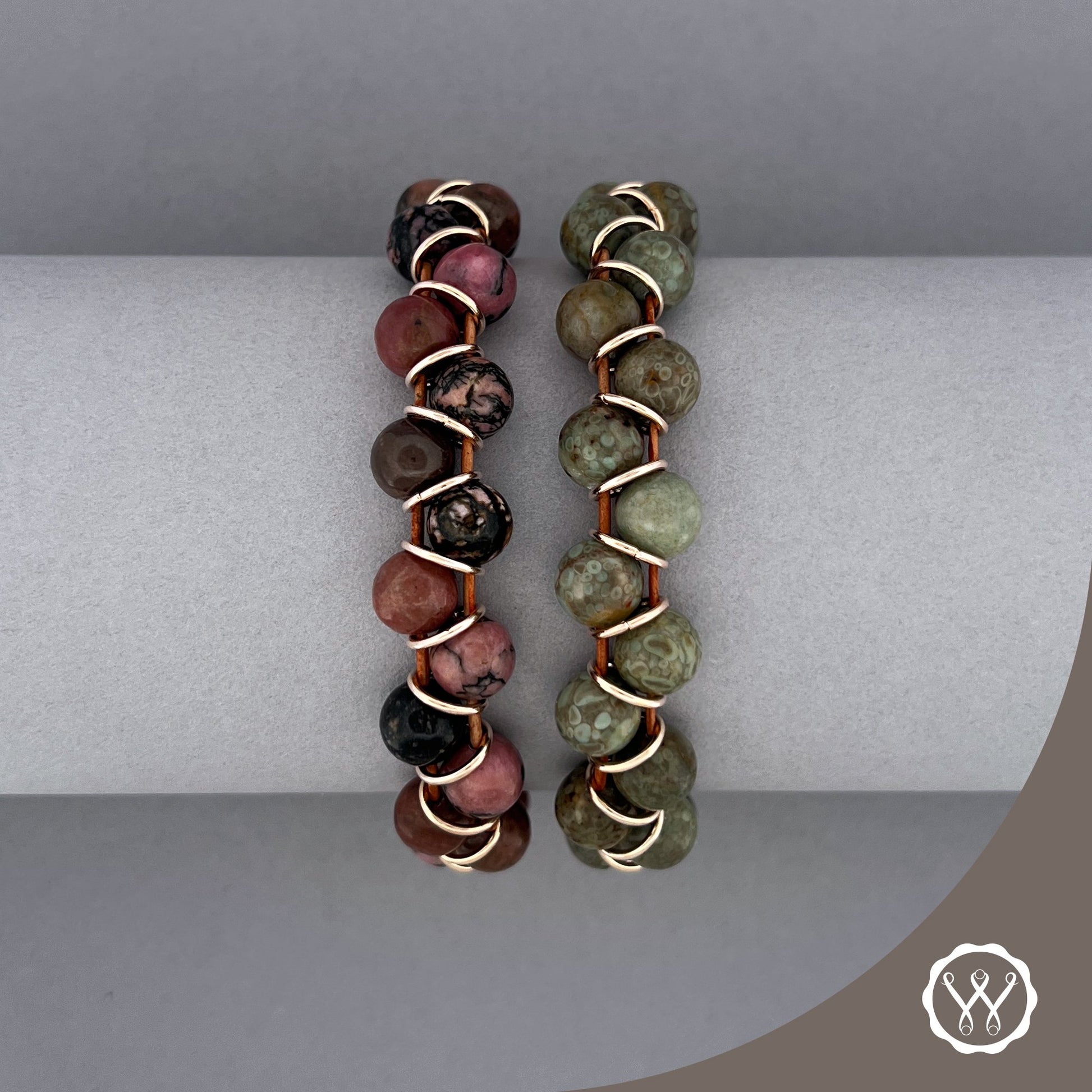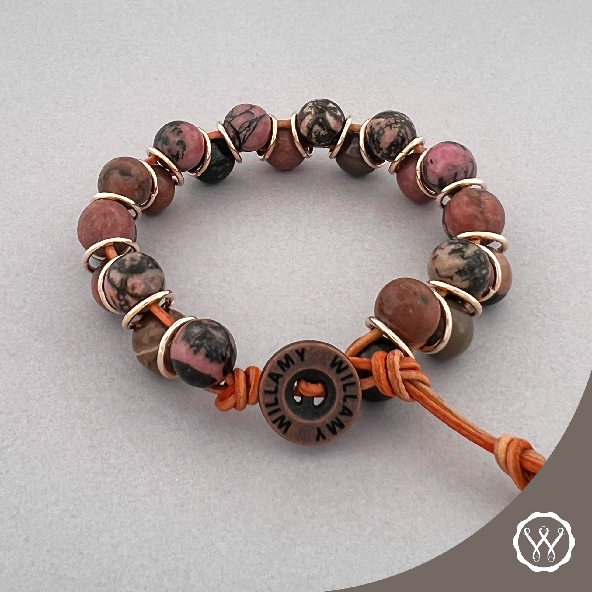 (2) 8mm Rose Maifanitum stones Rose Gold-tone Jump Rings on Genuine Leather.