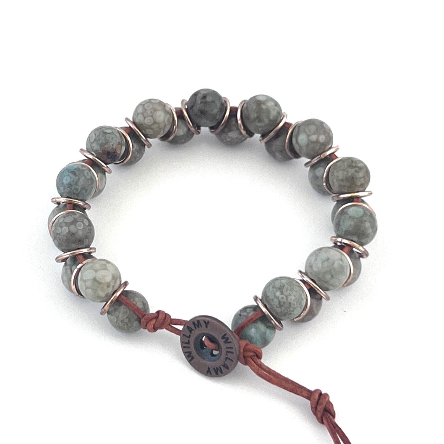 Our Khaki bracelet is a perfect blend of earthy and distinctive, a great every day piece and neutral stacking option. Fastens with an engraved Willamy metal button. Includes XS-S-M-L Sizing Options