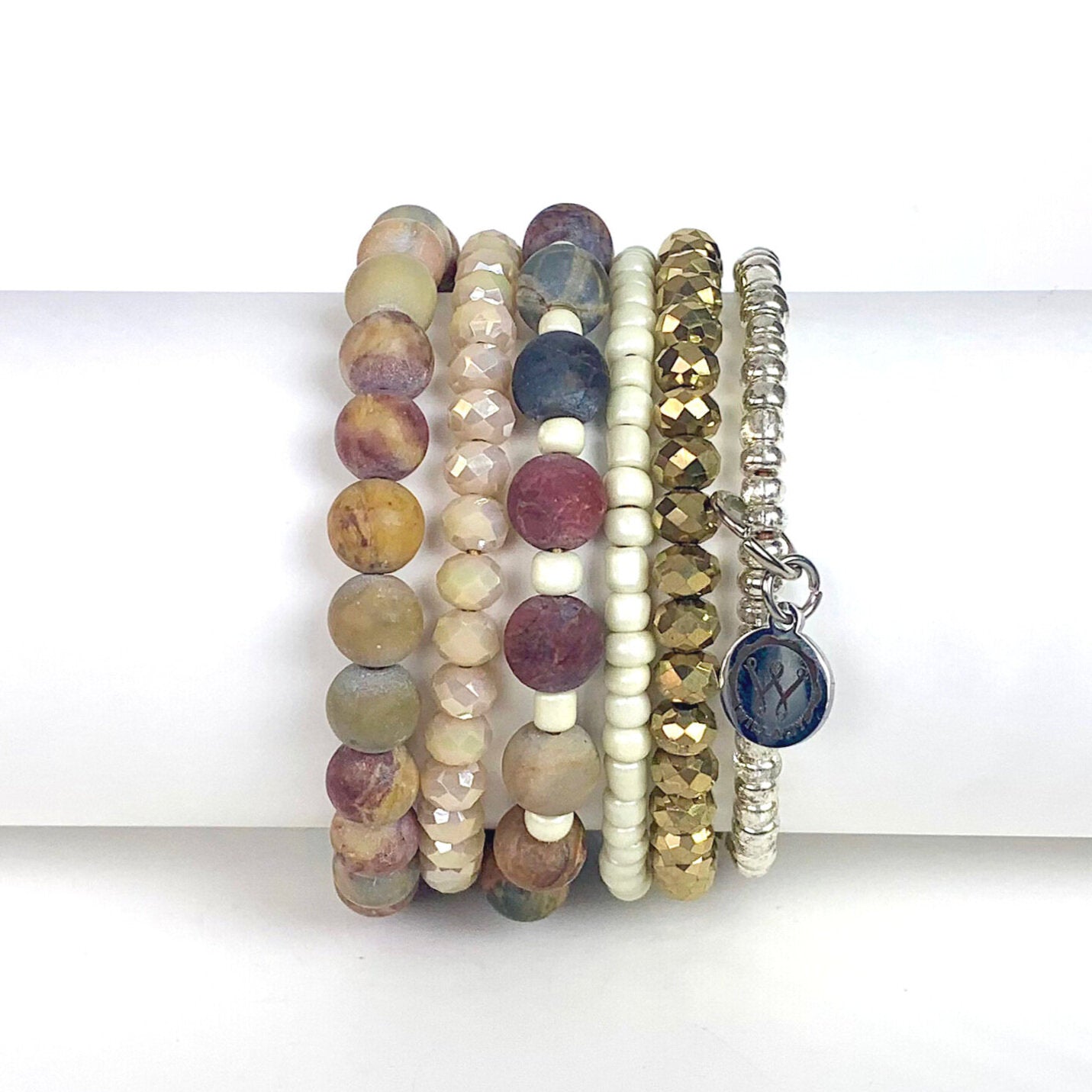 Combo includes 3 artisan bracelets (double strands) handcrafted with two types of Natural Picasso Jasper stones with Miyuki glass beads and crystals on genuine leather. Fastens with an engraved Willamy metal button.