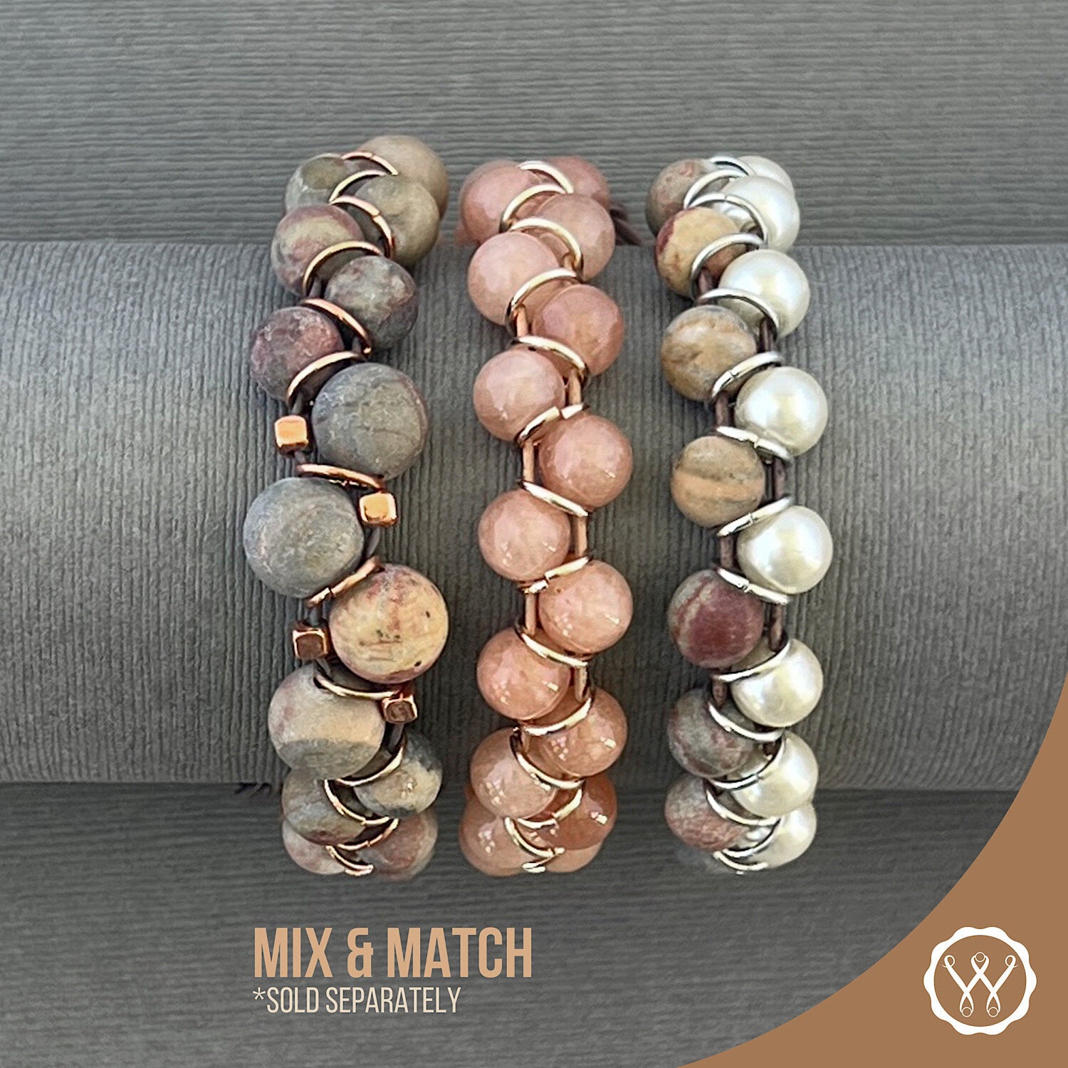 This exquisite Picasso Pearl stone bracelet is a unique and fashionable combination with Czech glass pearls on natural leather. Fastens with an engraved Willamy metal button.