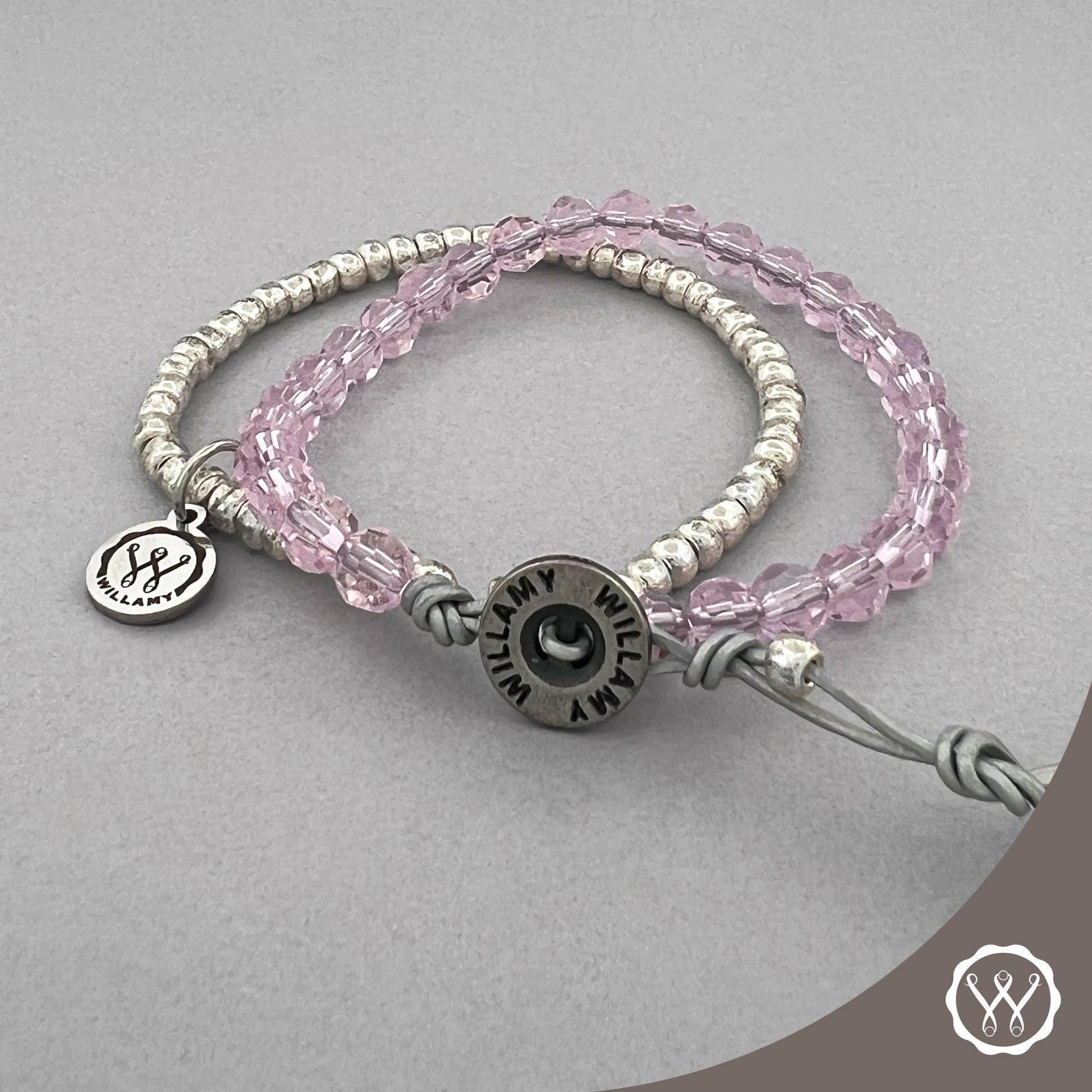 (2) Silver-tone Glass Seed Beads & Pink Crystals on Metallic Leather.