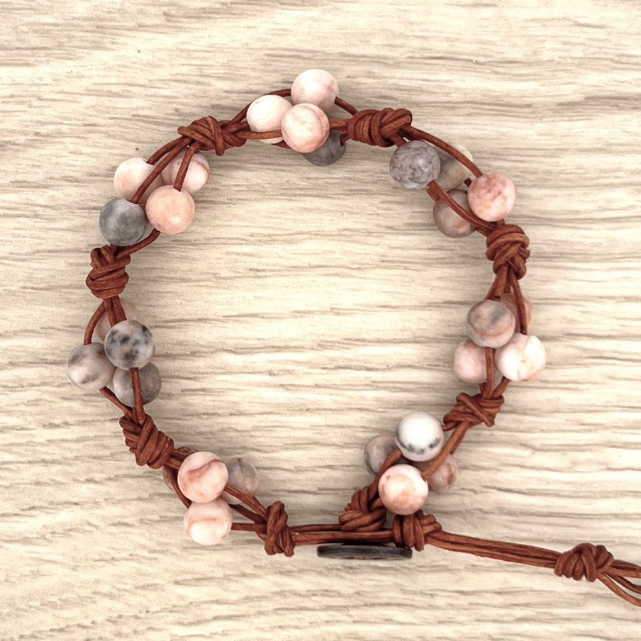 - Materials: 6mm Pink Zebra stones and genuine leather