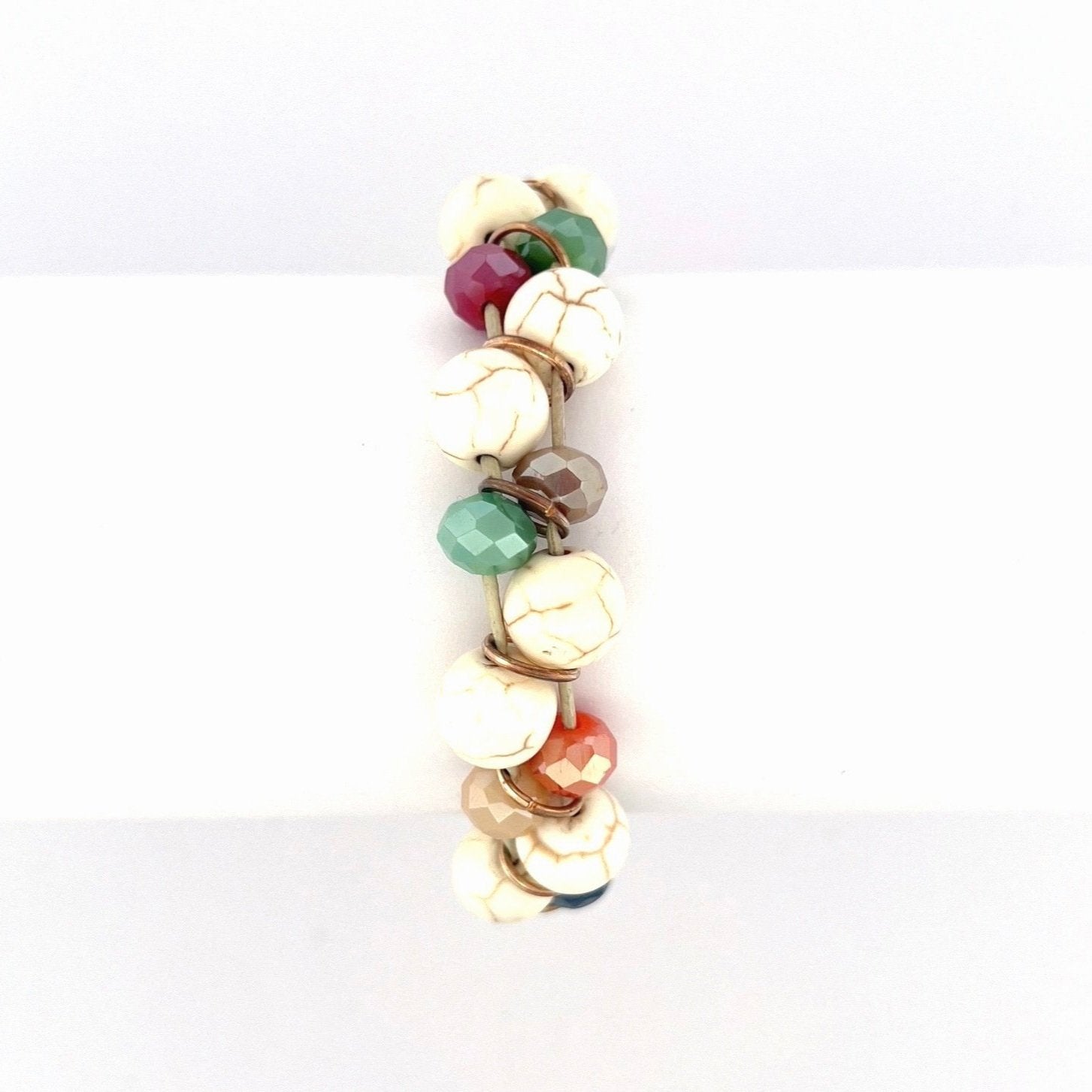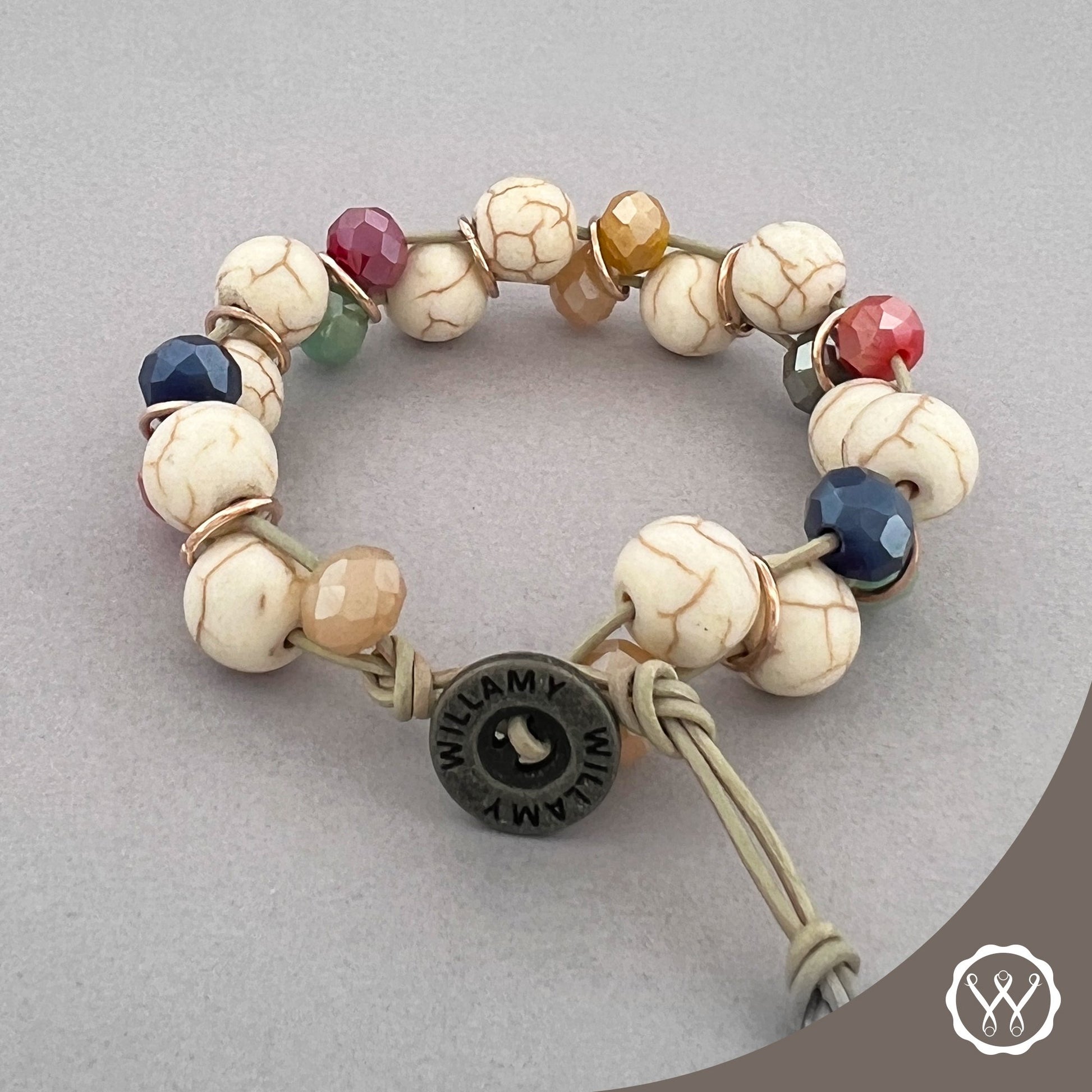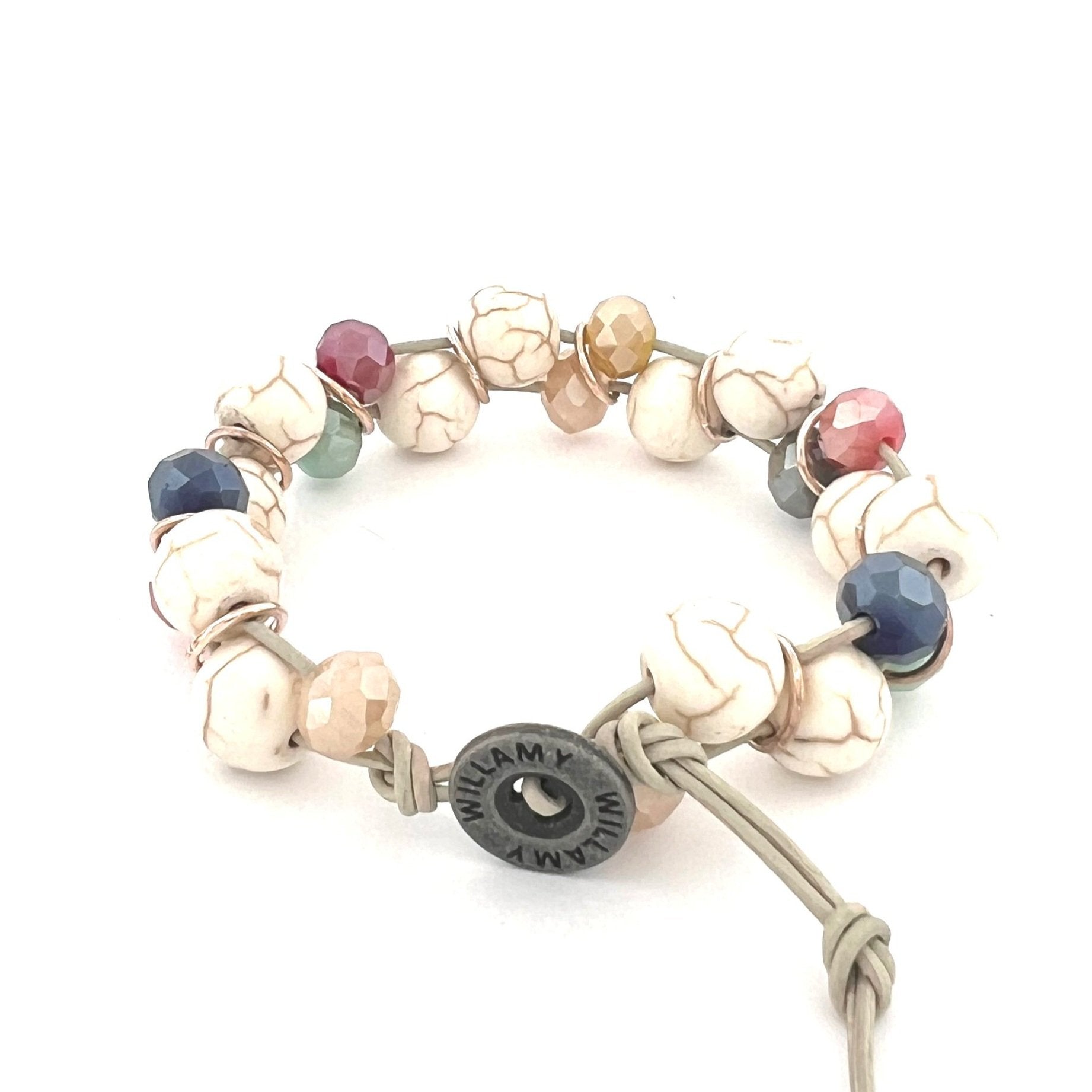 Our new Roxanne bracelet is a captivating mix of Ivory Howlite and multi-colored crystals on natural leather sure to add a touch of sophistication to your everyday look.