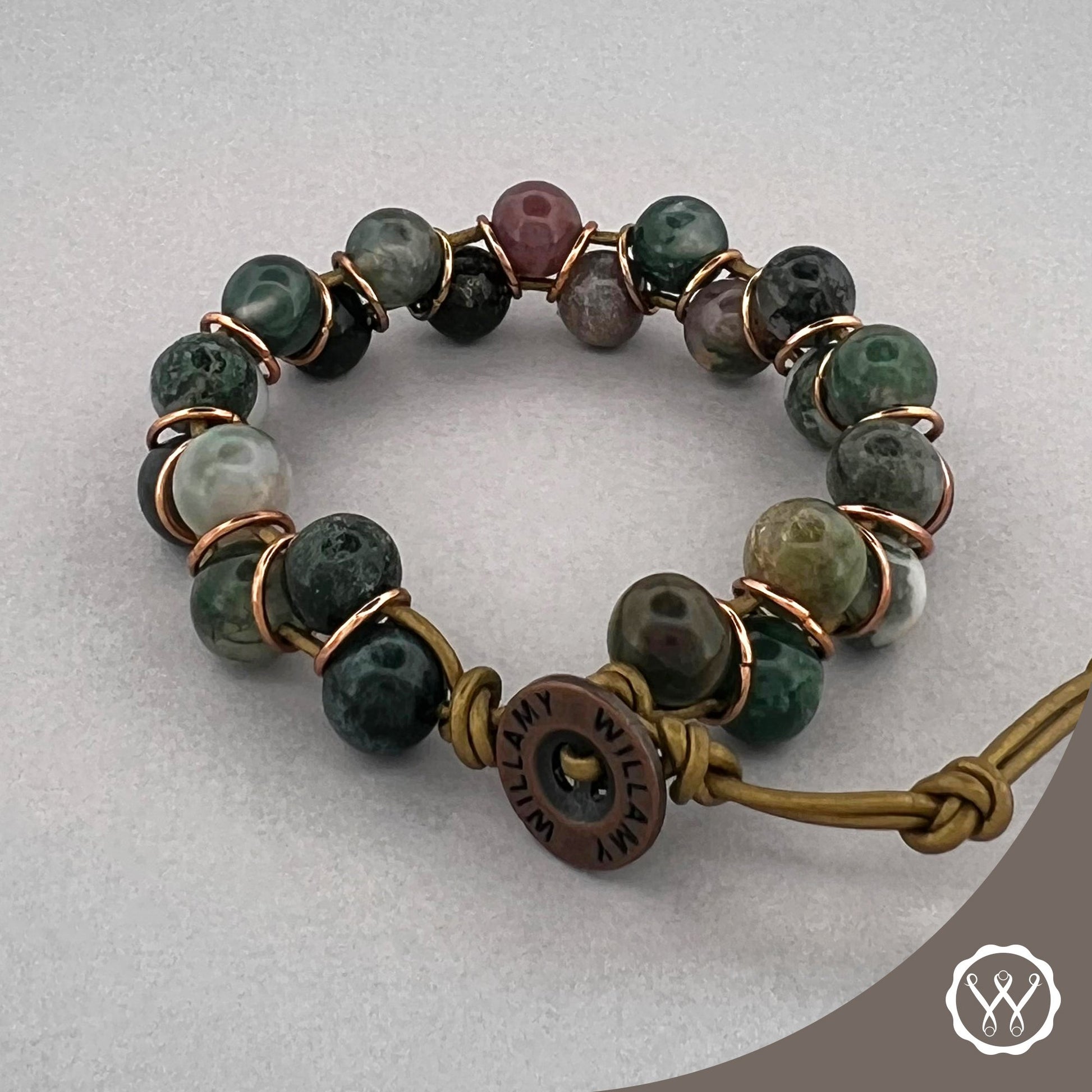 (1) 8mm India Stone Leather Bracelet with Gold-tone Crystals & Metal Jump Rings