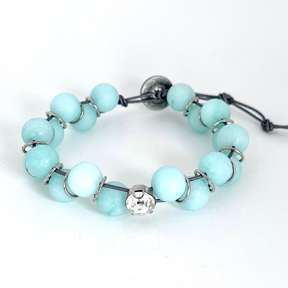 Wonderfully whimsical, this frosted sea foam Agate stone is a lovely accent piece for any occasion. Handcrafted on genuine leather with a center rhinestone. Fastens with an engraved Willamy metal button.