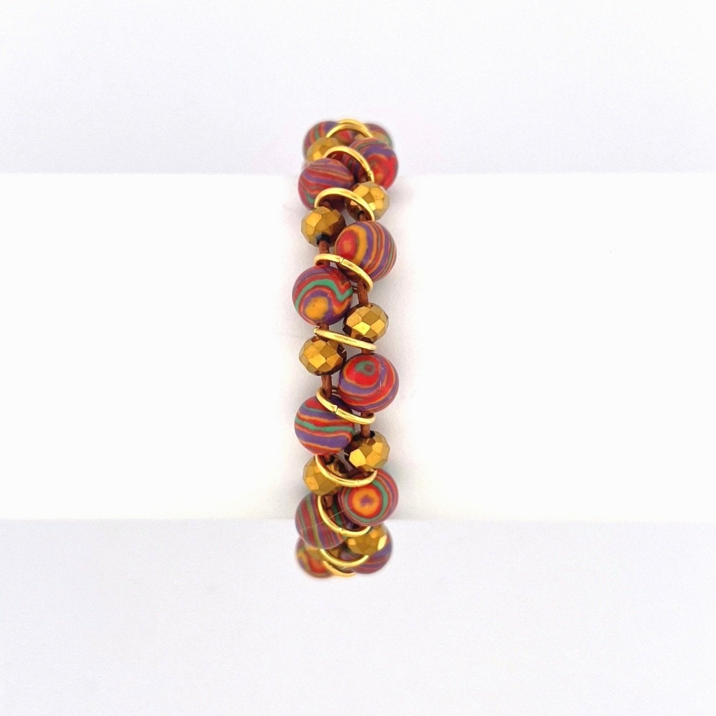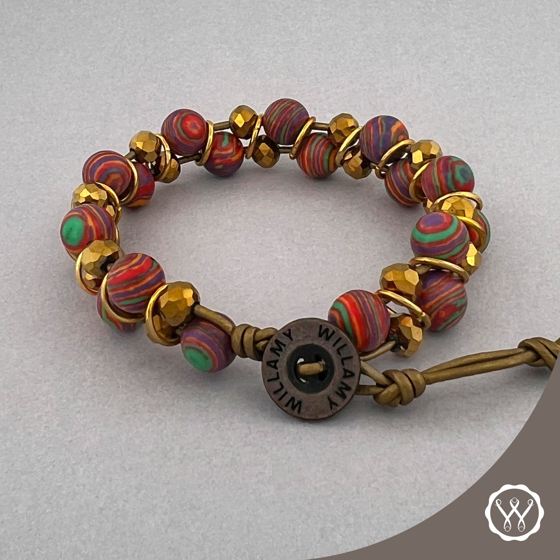 A must-have bracelet adorned with a vibrant mix of gold crystals and unique Rainbow stone on natural leather. Fastens with an engraved Willamy metal button.