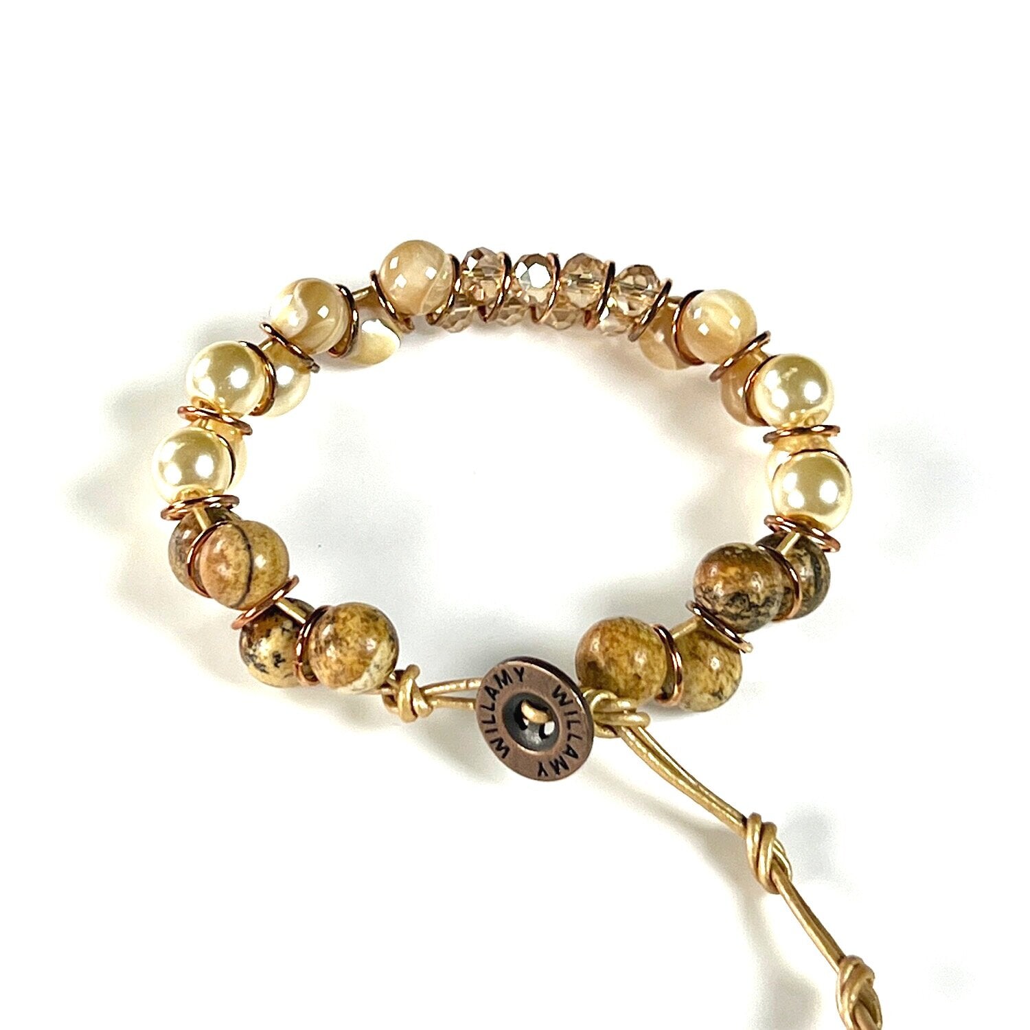 Our new Shell Pearl Couture features a melody of graduated stones including 8mm Picture Jasper stones, 8mm cream glass pearls, 8mm Trochus Shell, 6mm champagne crystals handcrafted on gold leather for an eye-catching look. Fastens with an engraved Willamy metal button.