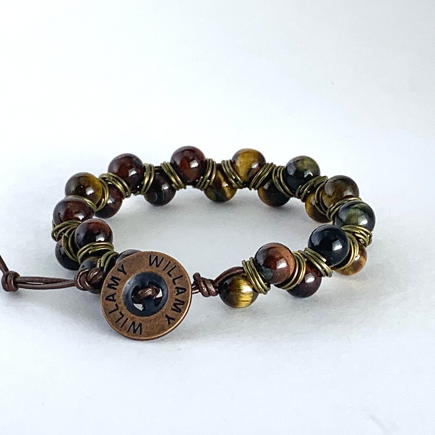Men's stackable single wrap bracelet featuring natural 8mm Tri-Color Tiger’s Eye stones on brown leather. Fastens with an engraved Willamy metal button.