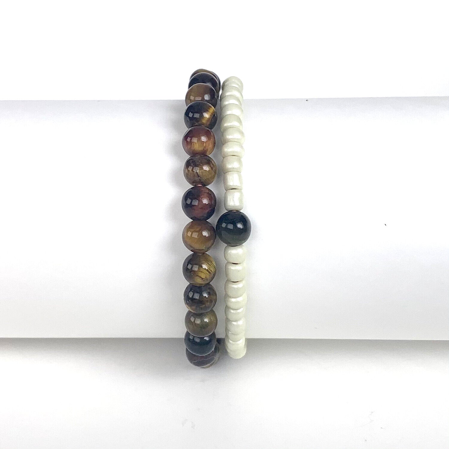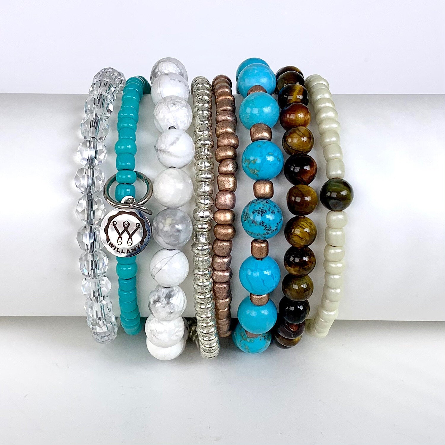 Combo includes 4 artisan (double strand) bracelets handcrafted with Turquoise stones, Tigers Eye, White Howlite, Miyuki glass beads & genuine leather. Fastens with an engraved Willamy metal button.
