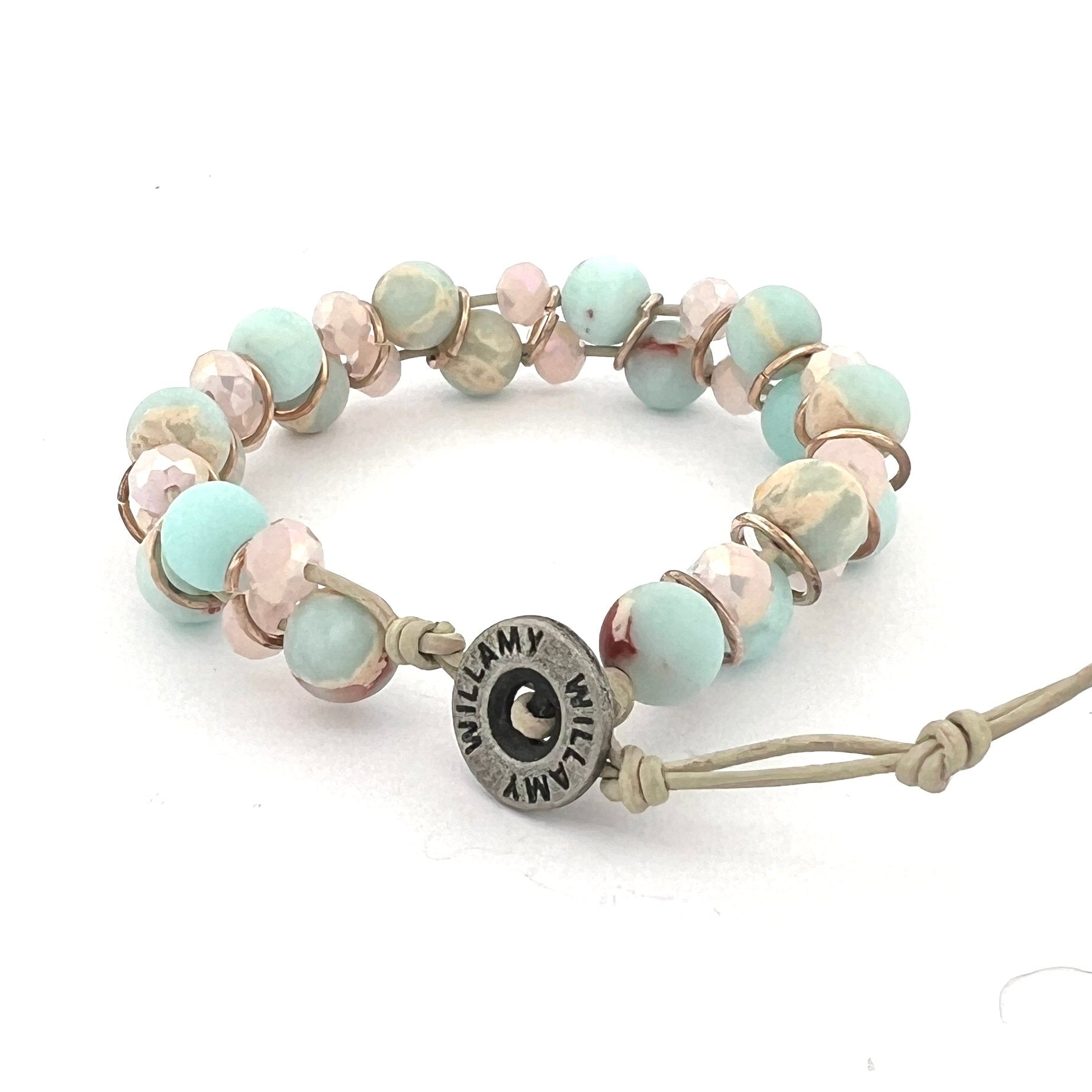 Our Vogue Shimmer Windsor bracelet features gorgeous and unique 8MM Natural Snakeskin Shoushan Stones and light pink crystals on tan leather. Fastens with an engraved Willamy metal button.