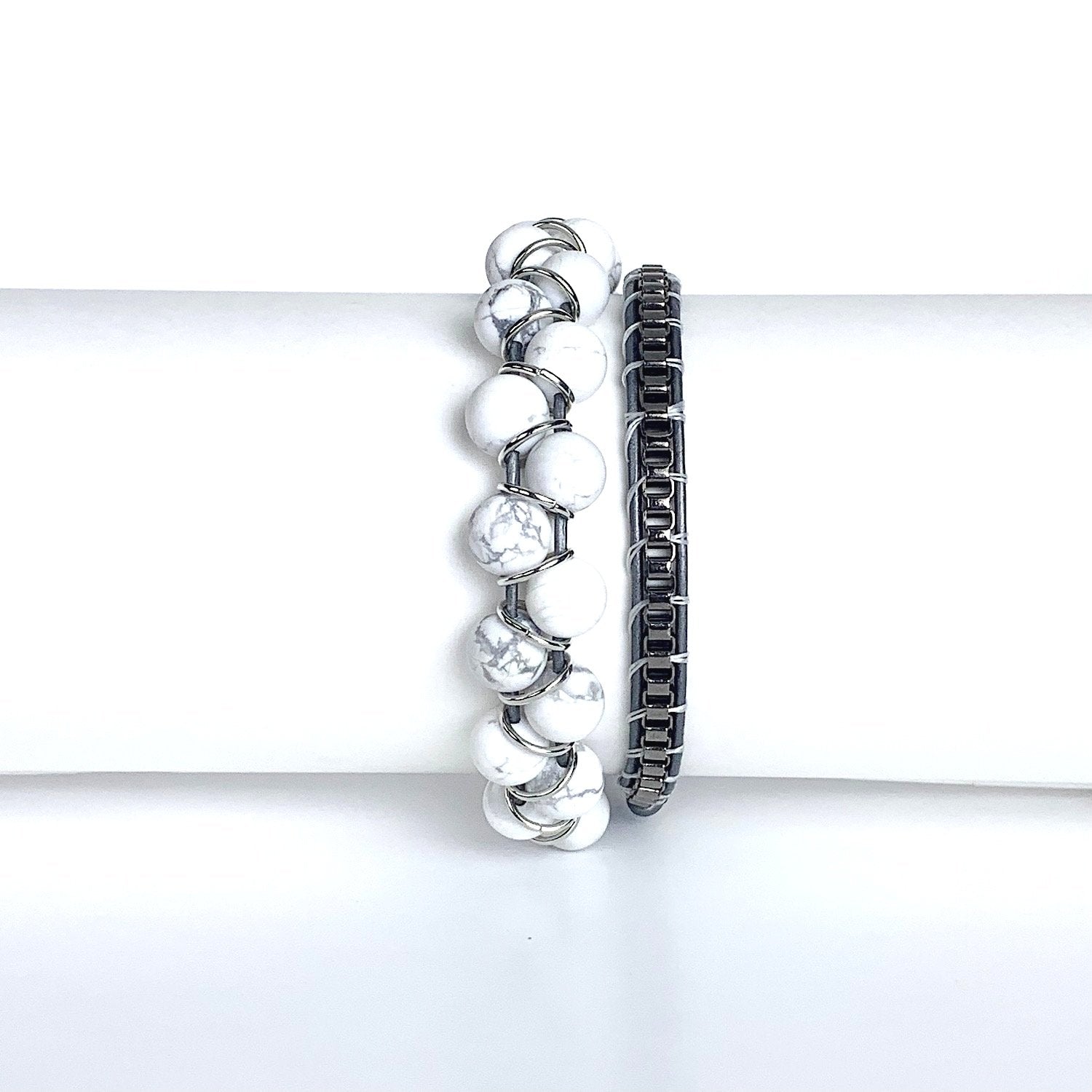 - Materials: 8mm White Howlite Stones, Metal Jump Rings, Gun Metal box chain